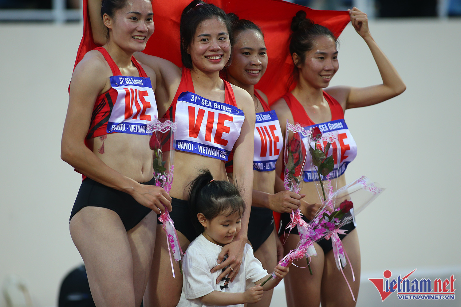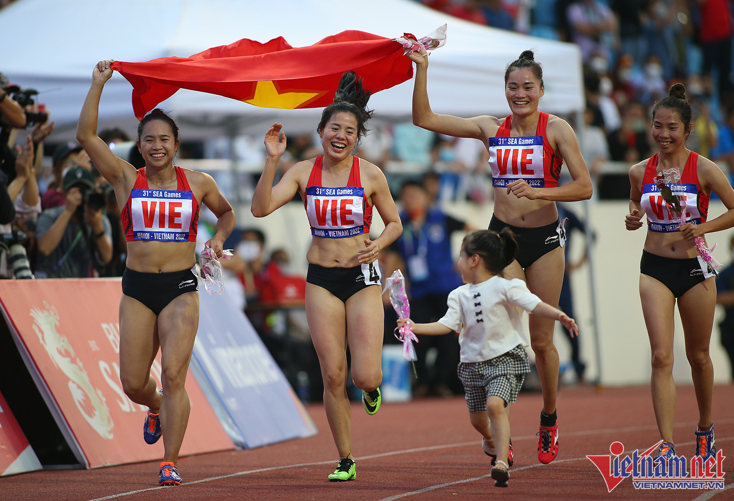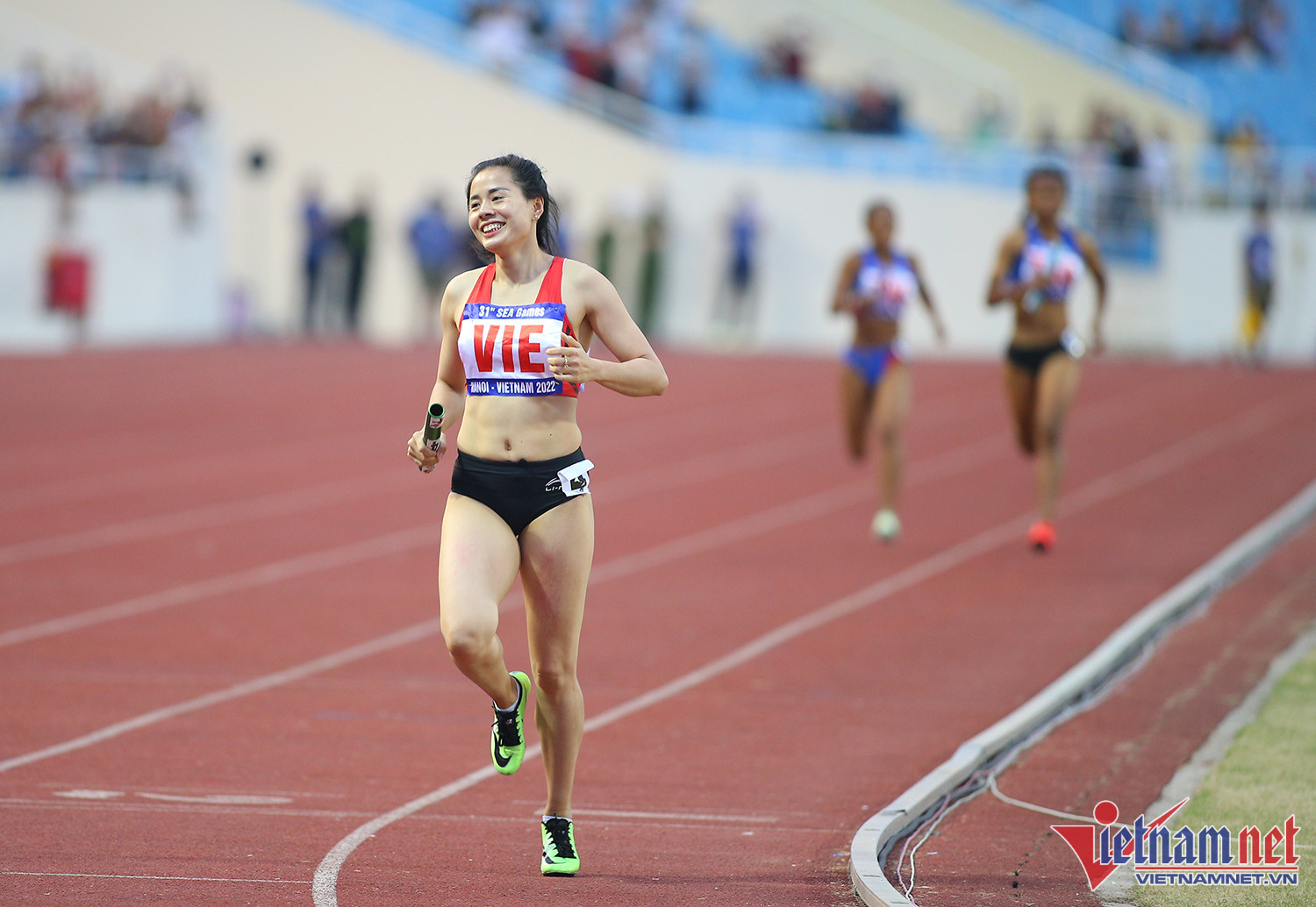 Tiếp sức 4x400m nữ là nội dung mà đội nữ Việt Nam là đương kim vô địch SEA Games. Vì thế, khi được thi đấu trên sân nhà, các VĐV Việt Nam thi đấu rất quyết tâm để bảo vệ ngôi hậu. Hoàng Thị Ngọc chính là người lĩnh ấn tiên phong cho đội chủ nhàQuách Thị Lan là VĐV thứ 2Cô gái người Thanh Hóa tiếp tục giúp chủ nhà Việt Nam dẫn đầu trước hai đội Thái Lan và PhilippinesRất đông người hâm mộ tới sân Mỹ Đình cổ vũ cho đội tuyển điền kinh Việt NamQuách Thị Lan trao gậy cho Nguyễn Thị Hằng Người chạy cuối cùng ở nội dung tiếp sức 4x400m là Nguyễn Thị HuyềnBà mẹ một con một mình băng về đích với thông số 3 phút 37 giây 99Cô gái người Nam Định bế con gái cùng các đồng đội ăn mừng tấm HCVĐây là tấm HCV thứ 10 trong sự nghiệp của Nguyễn Thị HuyềnỞ tuổi 29, Nguyễn Thị Huyền vẫn rất bền bỉTuyển điền kinh vượt chỉ tiêu đề ra sau mà tỏa sáng của Nguyễn Thị Huyền và các đồng đội