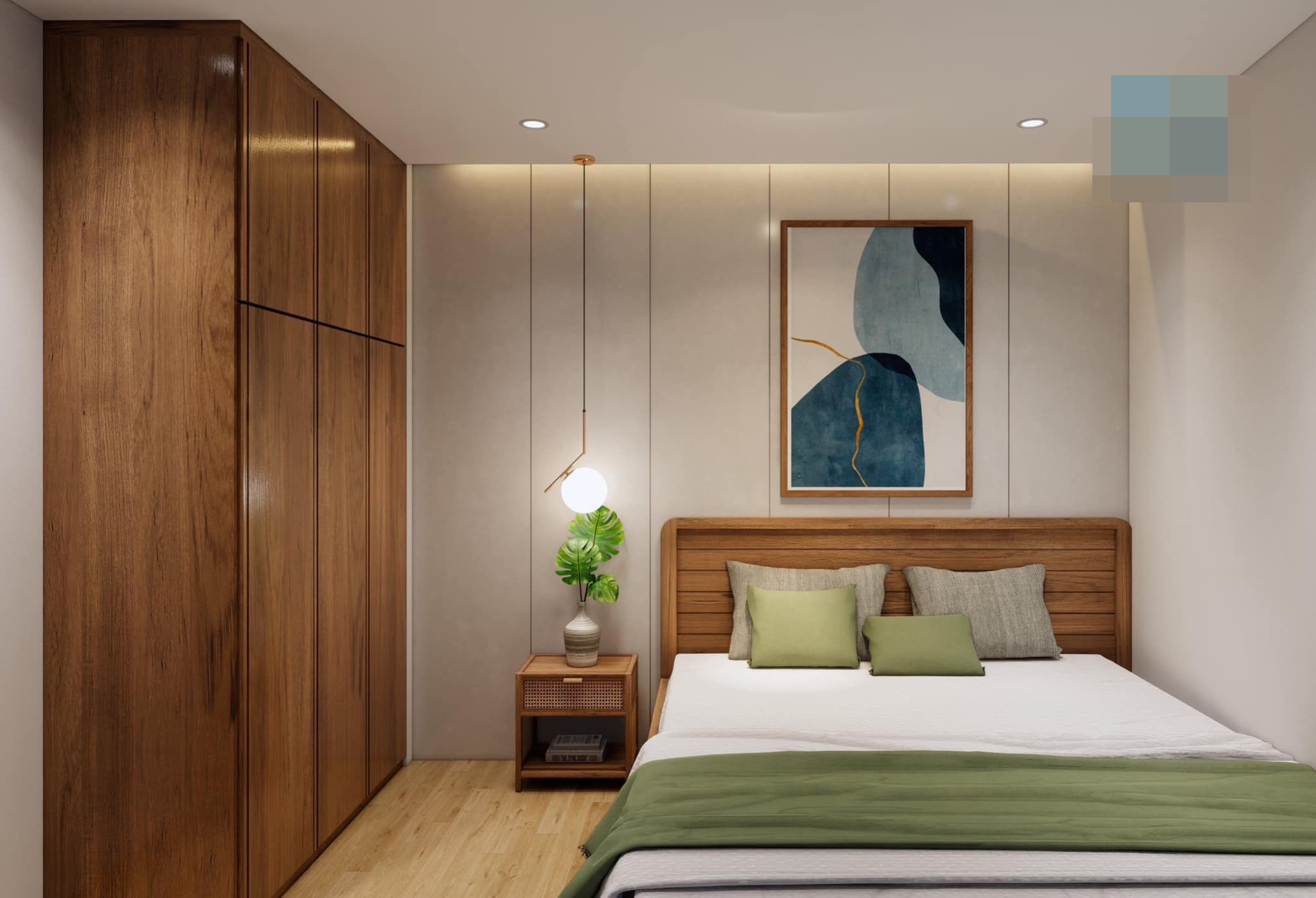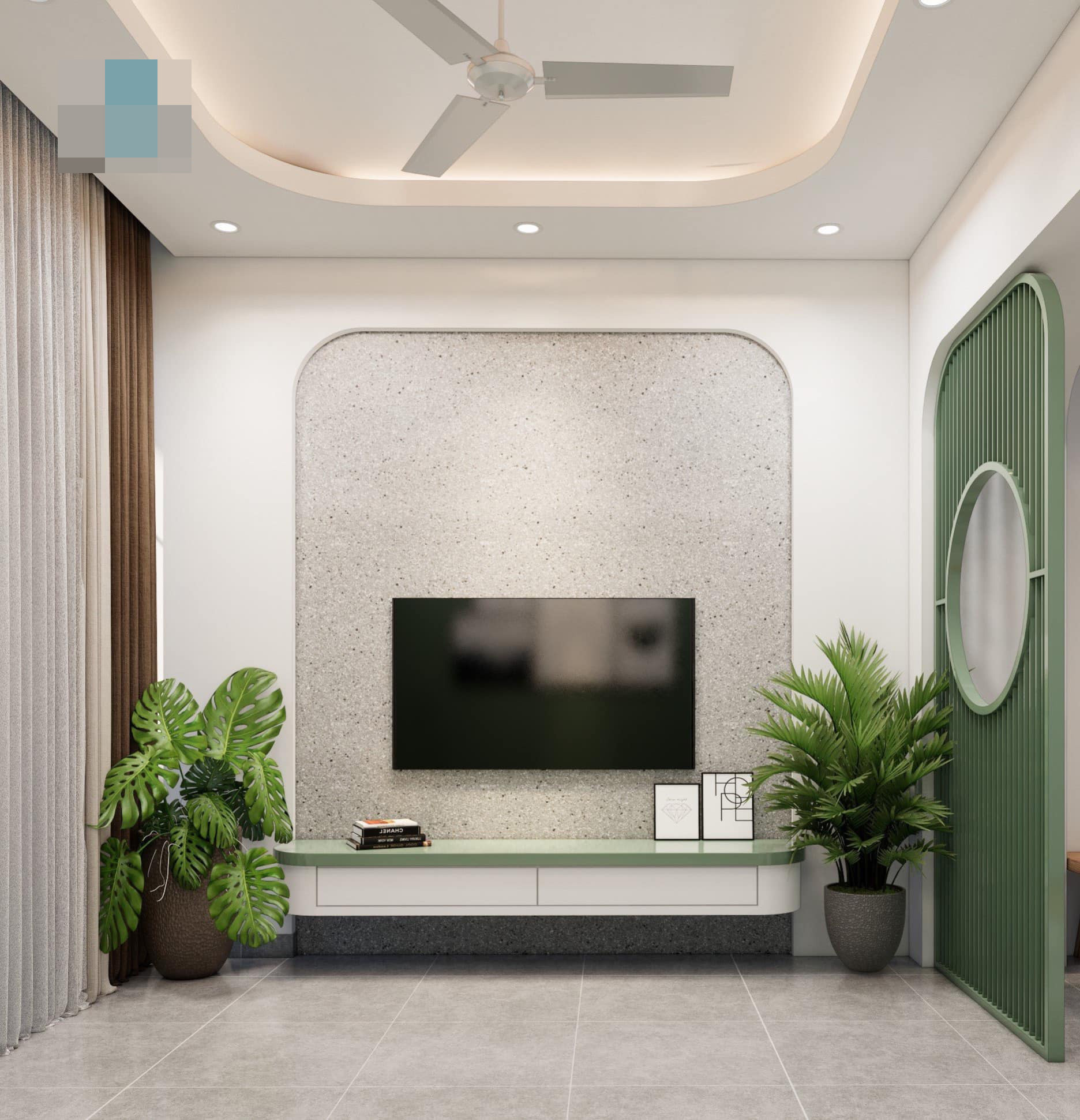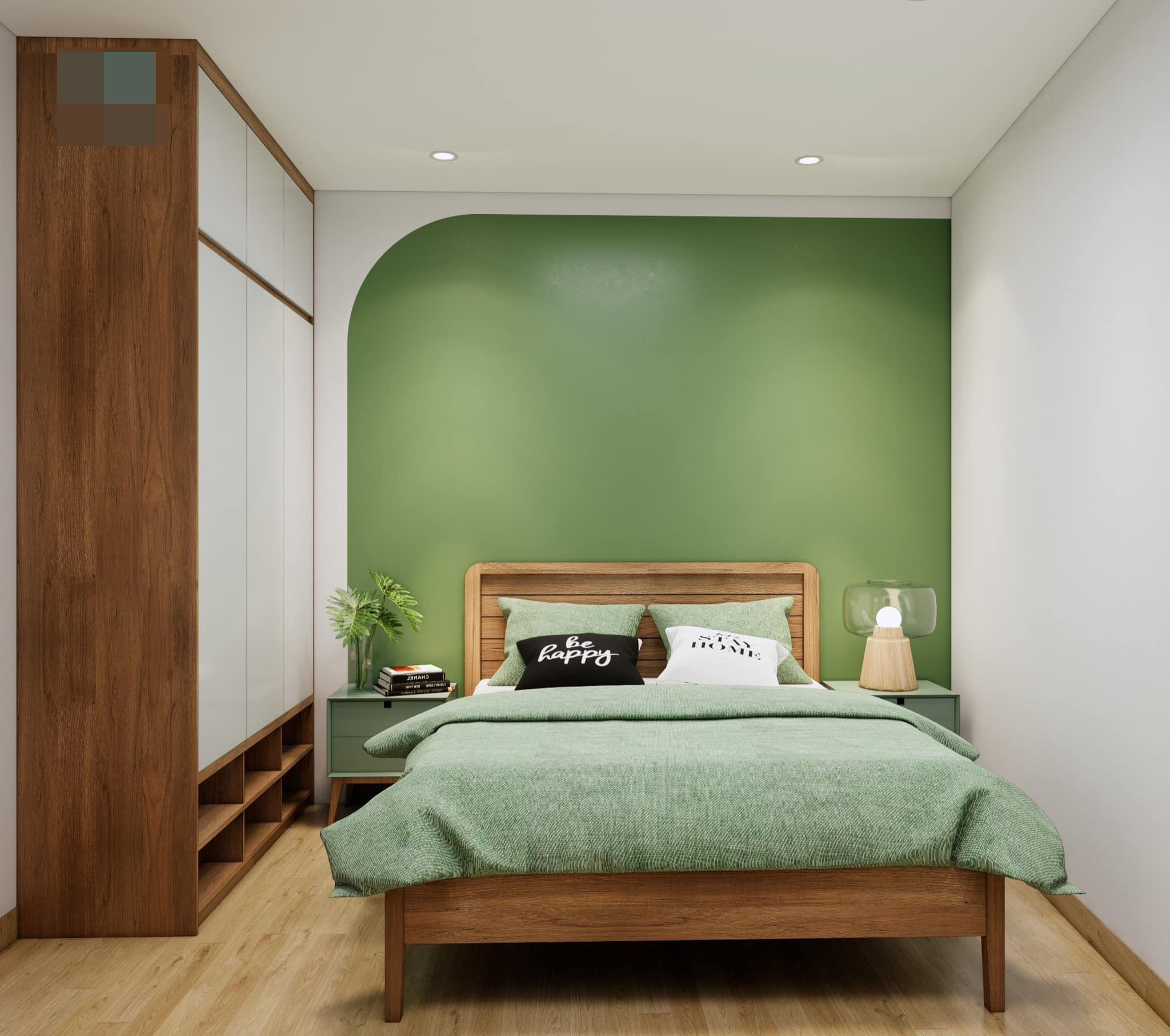 Màu xanh là tone nhấn xuyên suốt các không gian. Sự kết hợp ăn ý giữa màu trắng, màu gỗ và màu xanh cốm đã tạo nên một ánh nhìn cuốn hút và mê đắm.