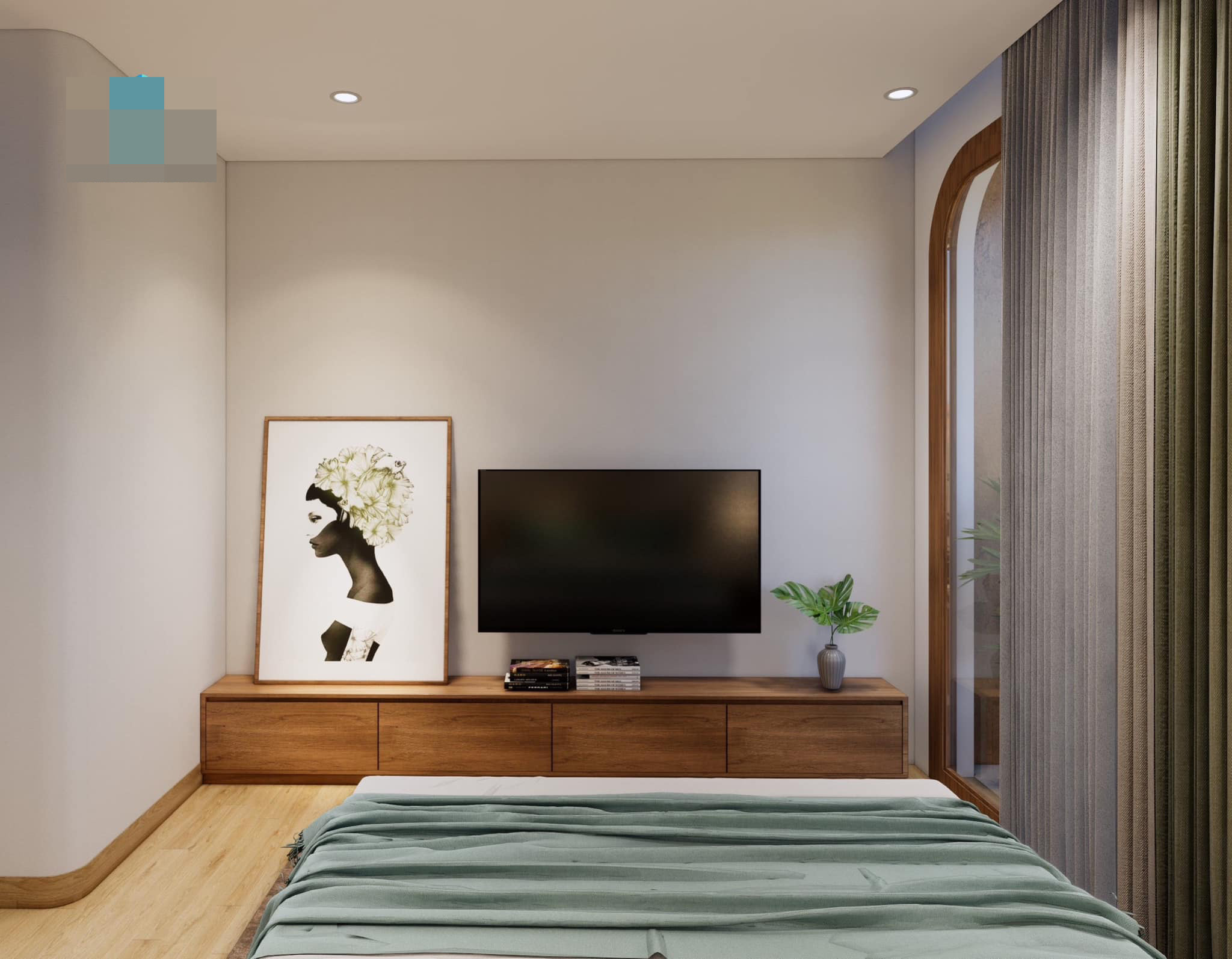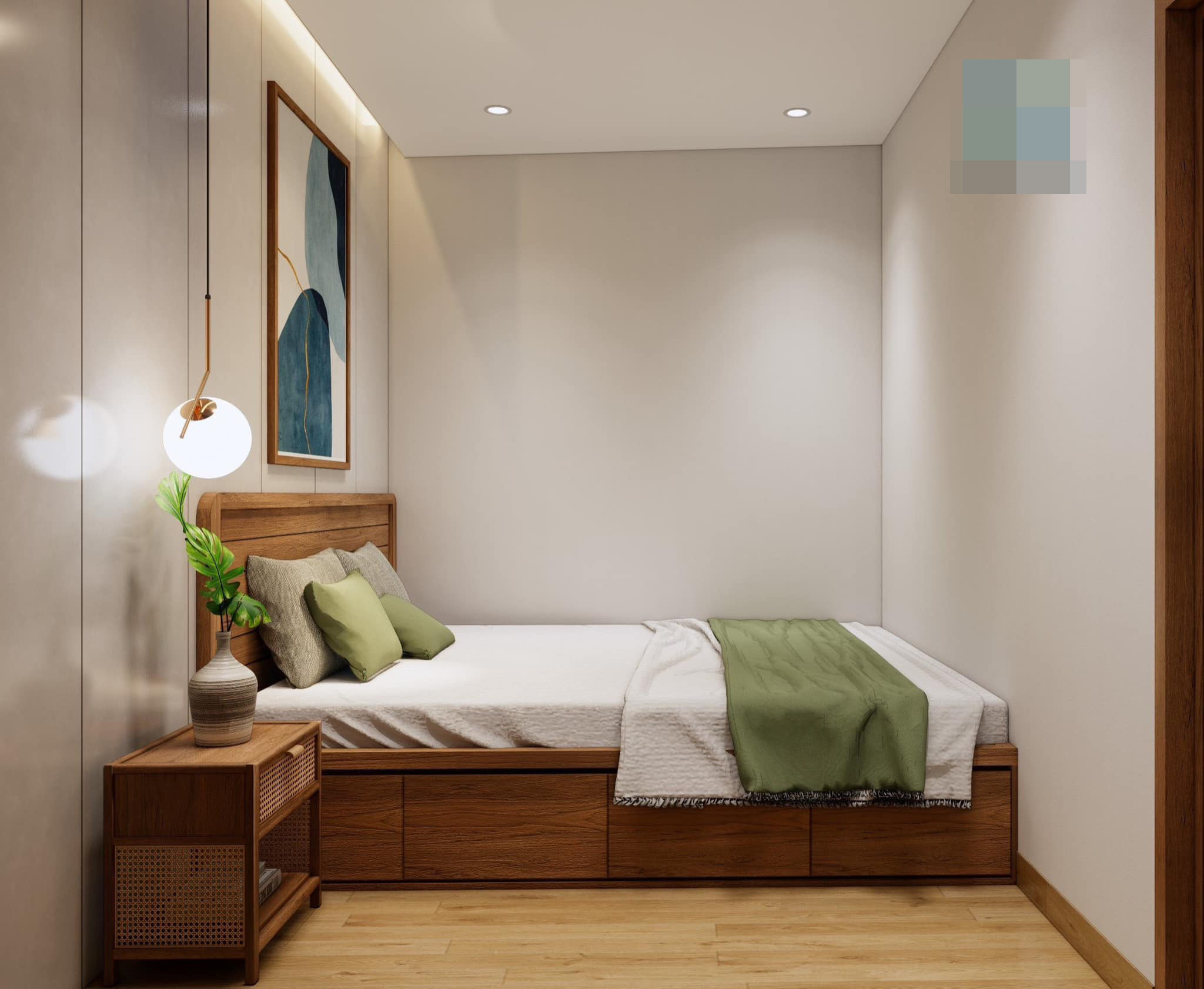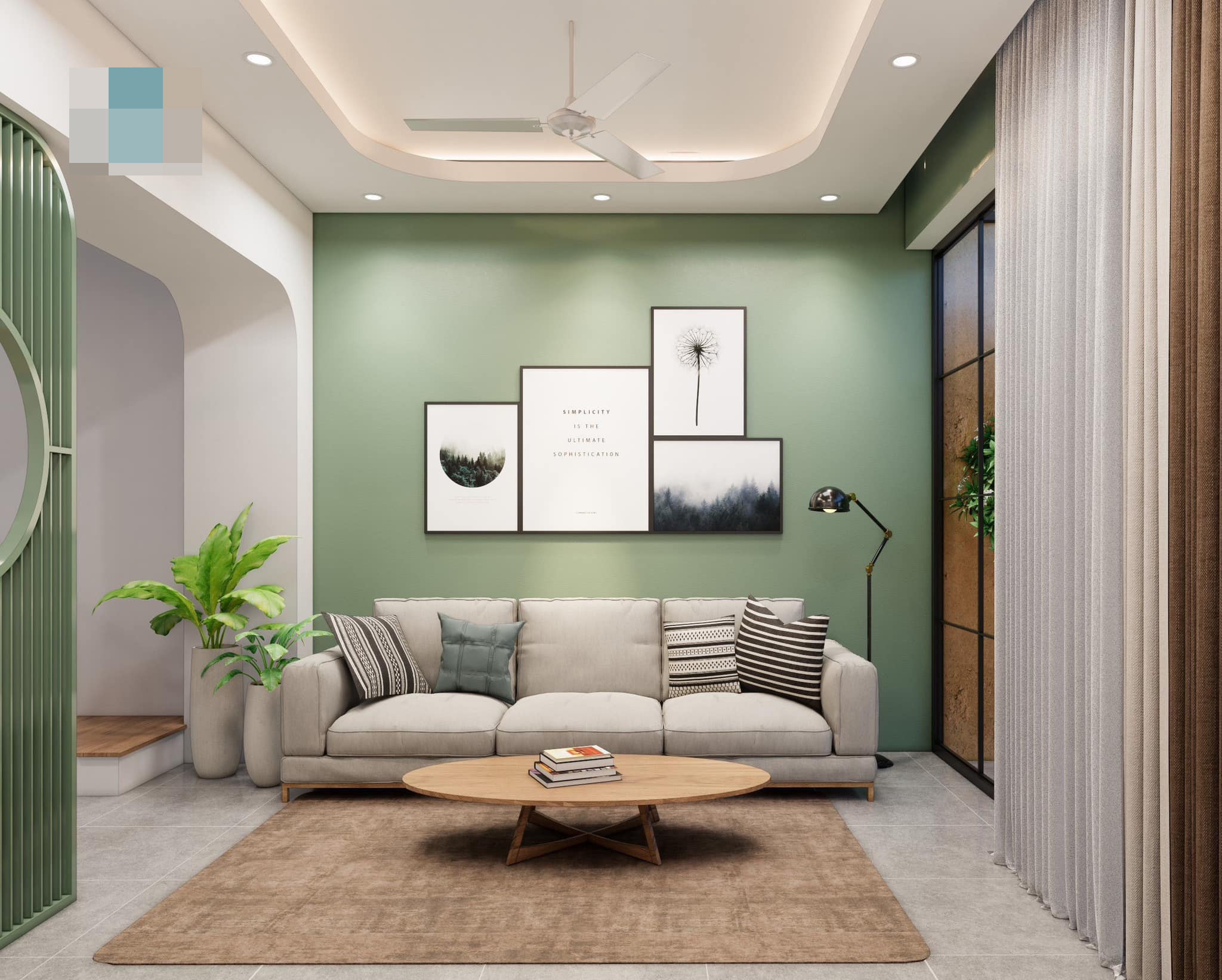Màu xanh là tone nhấn xuyên suốt các không gian. Sự kết hợp ăn ý giữa màu trắng, màu gỗ và màu xanh cốm đã tạo nên một ánh nhìn cuốn hút và mê đắm.
