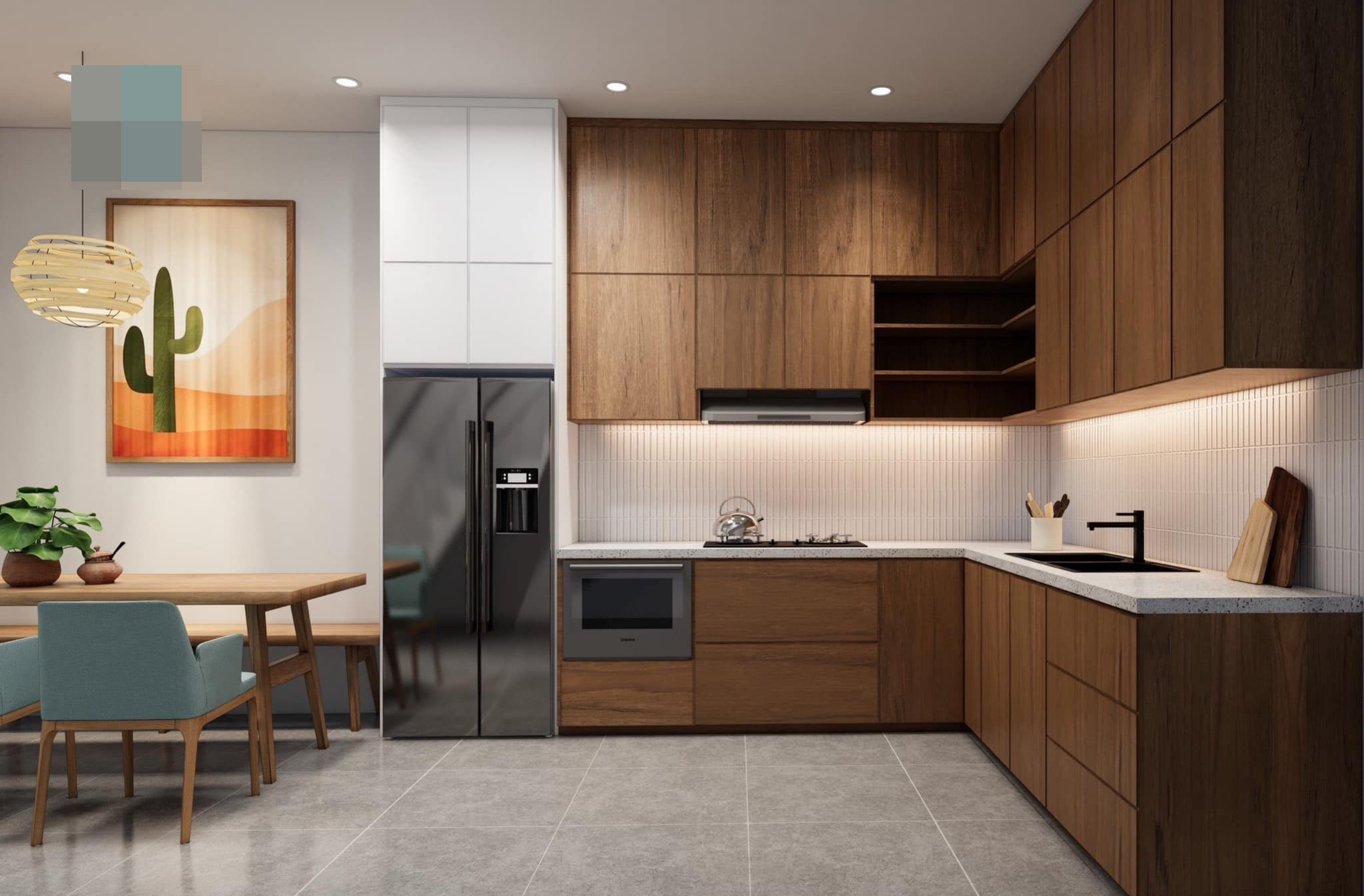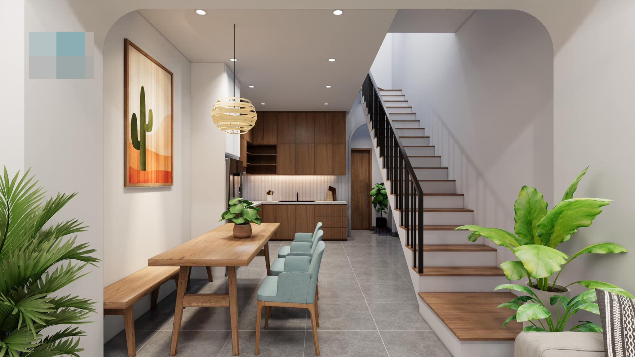 “Thủy house” là công trình nhà phố 2 tầng ở Bình Dương do kiến trúc sư Phan Hiển (Đà Nẵng) cùng cộng sự thiết kế năm 2022. Dự kiến sẽ khởi công trong thời gian tới. Mặt tiền nhà sử dụng những khung cửa bo cong tạo điểm nhấn và sự mềm mại cho công trình. Cửa kính là giải pháp có chi phí rẻ, đảm bảo thẩm mỹ giúp nhà sáng thoáng hơn. Khu vực tường bao ốp đá rối chống rêu mốc, mang một chút hoài cổ. Trên mảnh đất của gia đình, chủ đầu tư muốn thực hiện những mong muốn về không gian sống lý tưởng, có sự cách tân ấn tượng theo phong cách hiện đại, trẻ trung mà vẫn đảm bảo được không khí ấm cúng và tạo sự thoải mái cho các thành viên. Do diện tích chiều ngang nhỏ nên nhóm tư vấn chủ đầu tư xây nhà 2 tầng để mở rộng thêm diện tích sinh hoạt, công năng cũng như ý muốn về một khoảng không gian nho nhỏ để có sự “góp mặt” của cây xanh hay giàn hoa, góp phần tạo điểm nhấn trang trí cho ngôi nhà thêm ấn tượng.Mặc dù diện tích không lớn nhưng sự tương tác giữa con người với thiên nhiên bên ngoài và bên trong ngôi nhà đều được kiến trúc sư chú trọng. Bởi vậy, ngoài việc trang trí bằng cây xanh, mỗi gian phòng đều được thiết kế lấy ánh sáng tự nhiên vào ban ngày, cùng với việc lựa chọn gam màu ấm áp và bài trí sắp xếp đồ vật, nội thất vừa tiết kiệm diện tích, vừa thuận tiện sử dụng lại đảm bảo vẻ đẹp thẩm mỹ cho toàn bộ ngôi nhà.Khu bếp chữ L rộng rãi, cho gia chủ thỏa sức bày biện và chế biến món ngon.