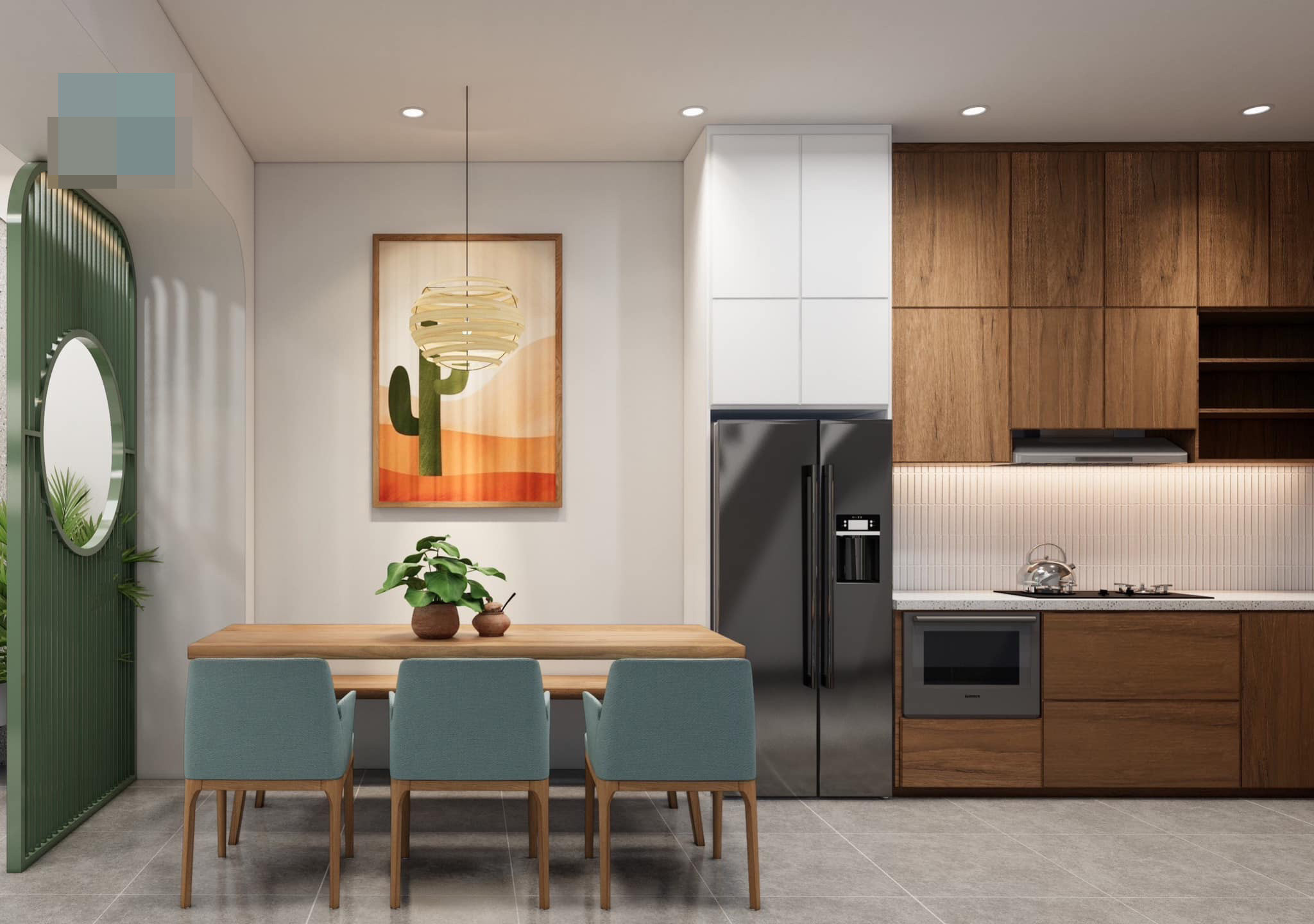 Phòng khách và bếp thông suốt, chỉ ngăn bằng bức vách lam gỗ màu xanh lá dịu mát. Cách thiết kế không gian mở như vậy giúp nhà rộng hơn về mặt cảm quan.
