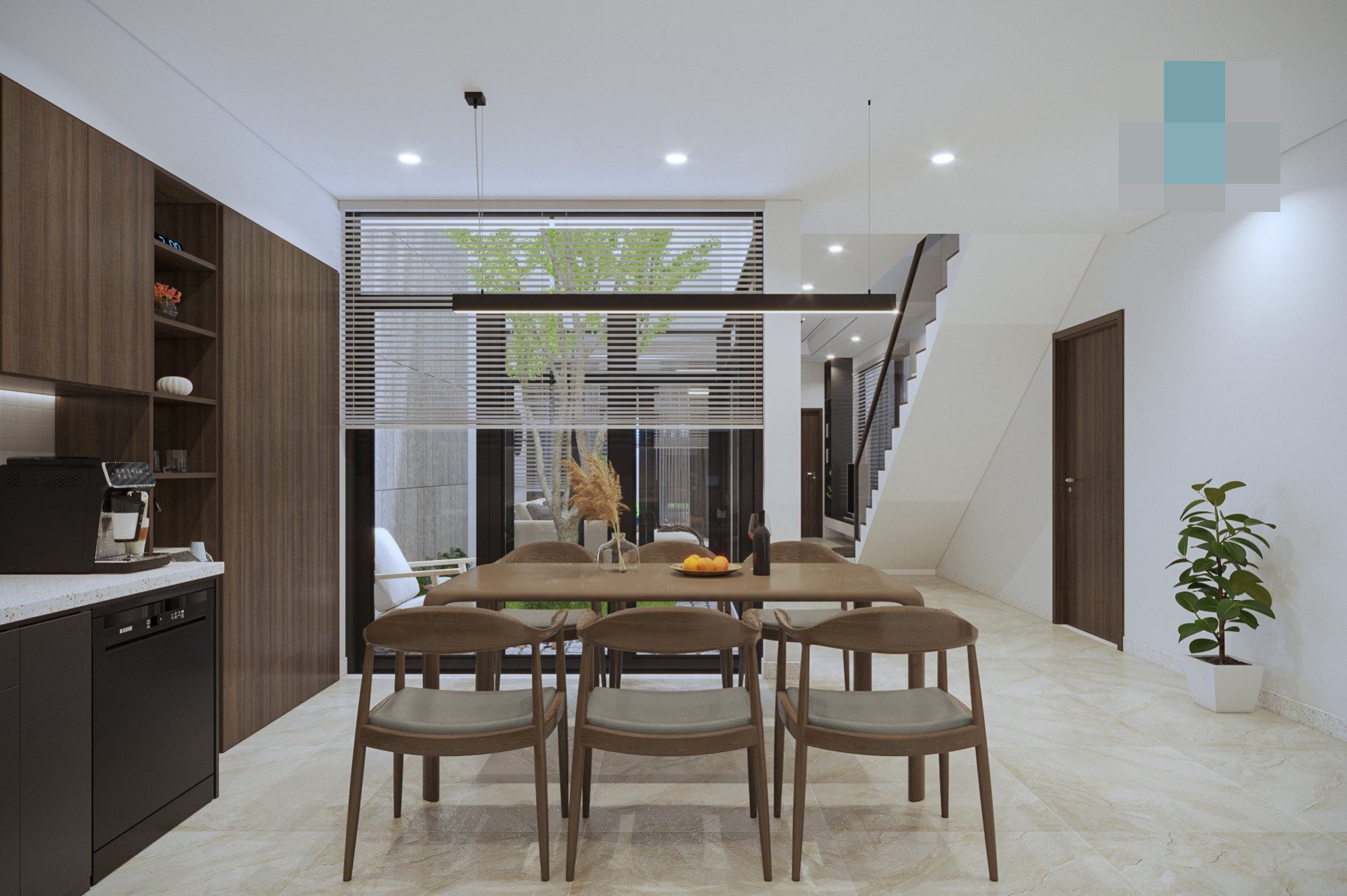 Bàn ghế ăn mang màu nâu gỗ, nổi bật trên sắc trắng của ngôi nhà. Phòng bếp sáng thoáng, rộng rãi với hệ tủ bếp chữ L cùng tone màu bàn ăn. Hệ tủ lớn là kho chứa đồ gọn gàng.