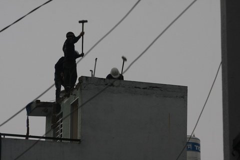 | Công nhân dầm mưa tháo dỡ căn nhà bị nghiêng |