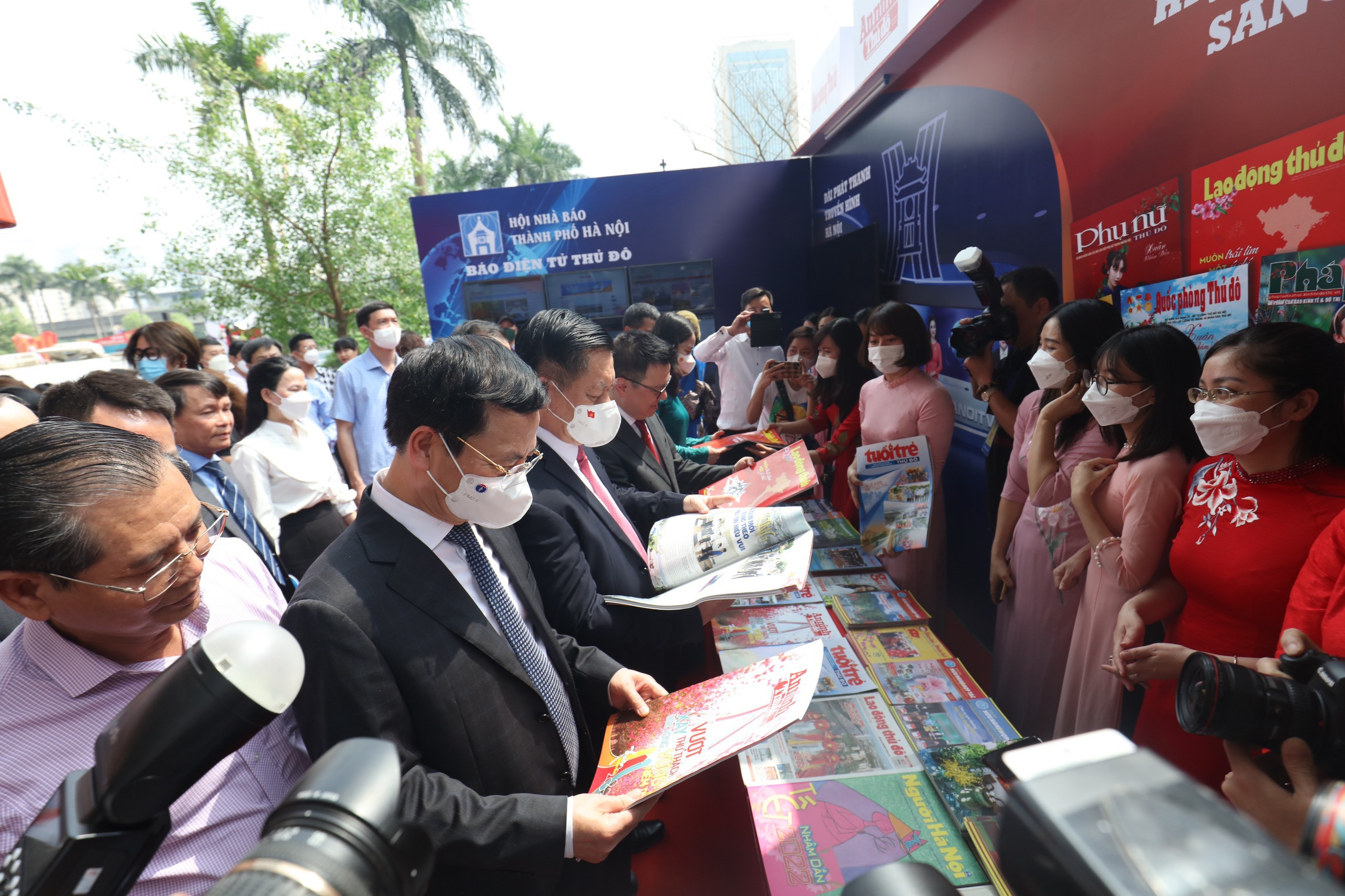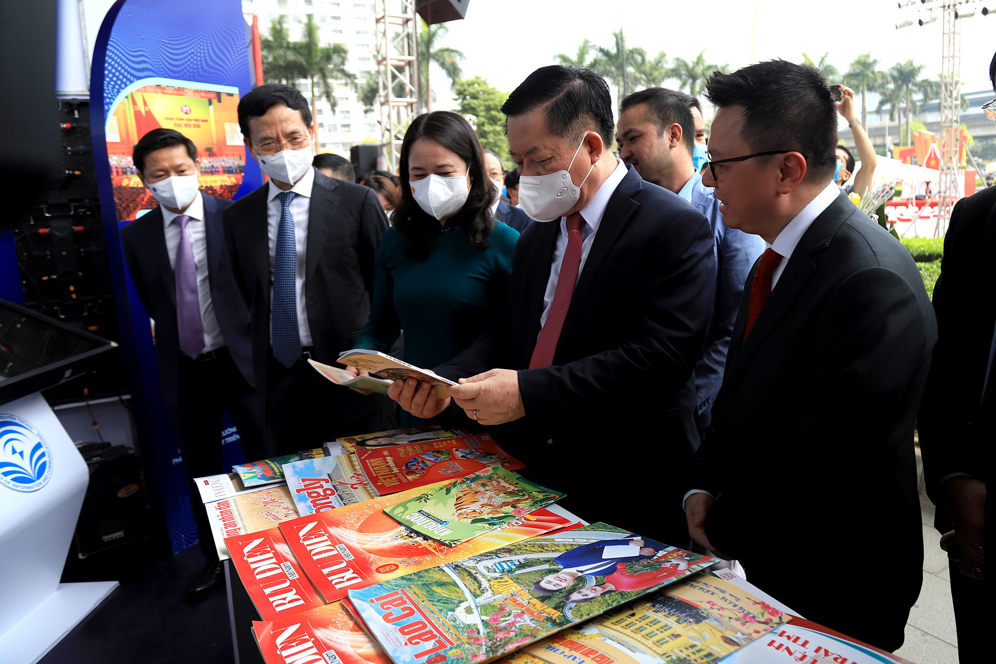 Các đại biểu thăm quan gian chuyên đề "Báo chí với sự kiện nổi bật của đất nước' của Bộ Thông tin và Truyền thông.Bộ trưởng Bộ Thông tin và Truyền thông Nguyễn Mạnh Hùng thăm gian trưng bày của báo Tiền phong