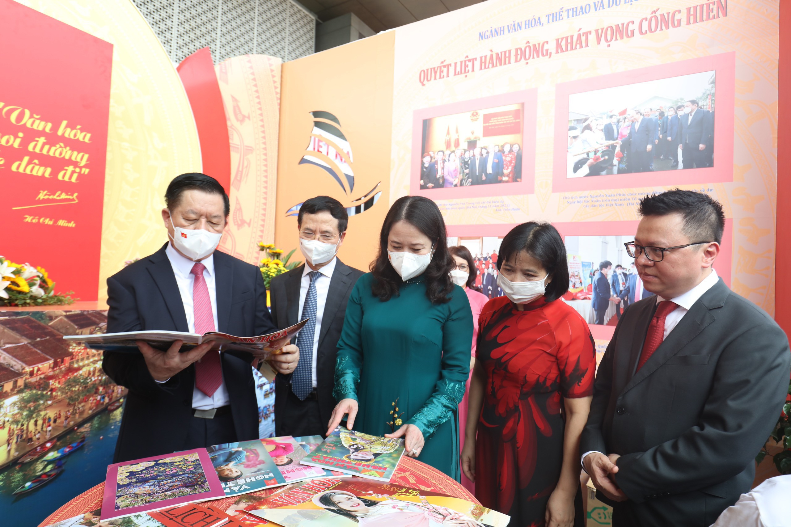 Lãnh đạo bộ, ban ngành cắt băng khai mạc Hội báo toàn quốc.