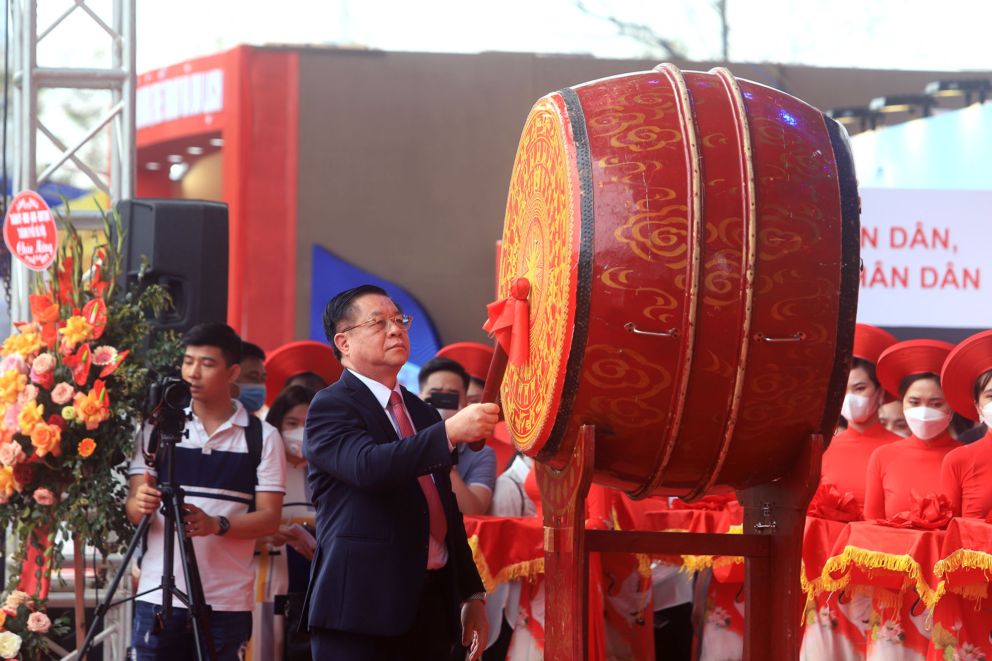 Trưởng Ban Tuyên giáo Trung ương đánh trống khai mạc hội báo.