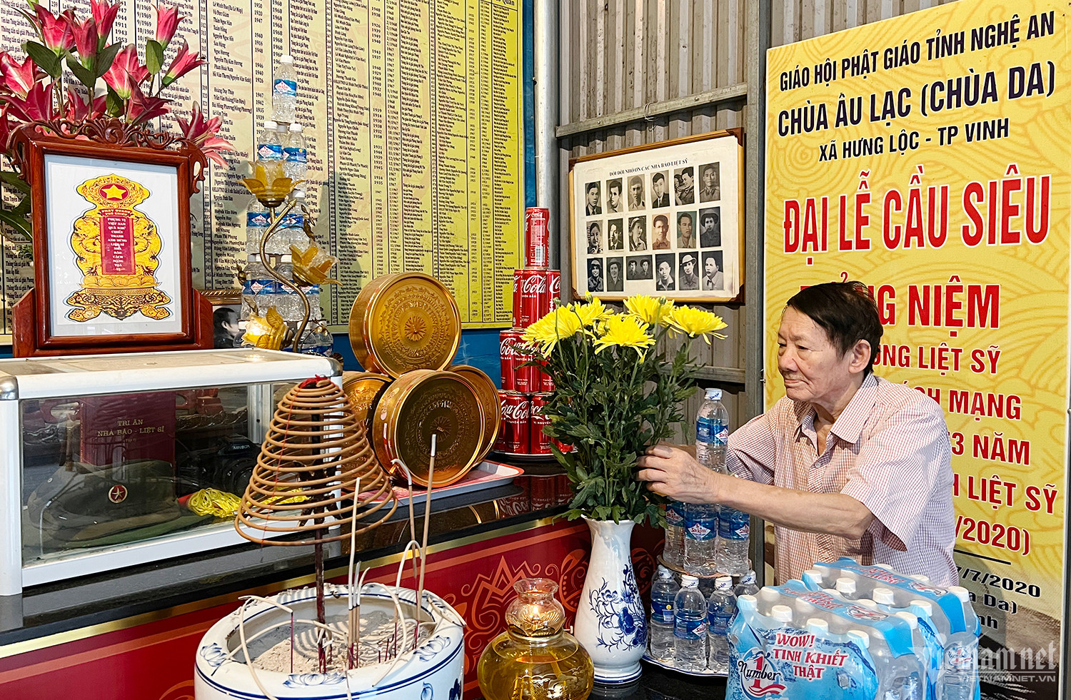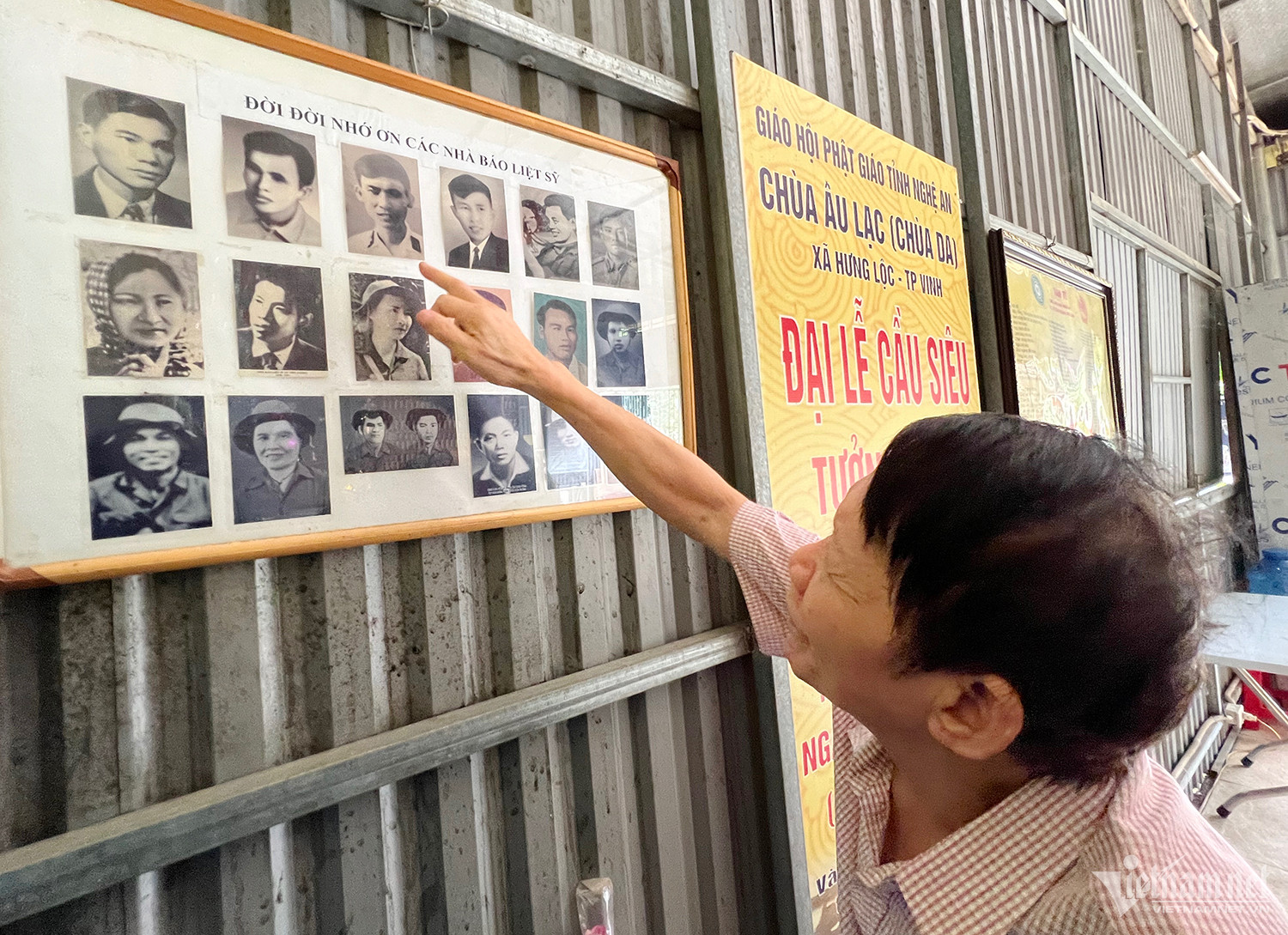 Nhà báo Trần Văn Hiền bên ban thờ các nhà báo liệt sĩ ở chùa Âu Lạc.