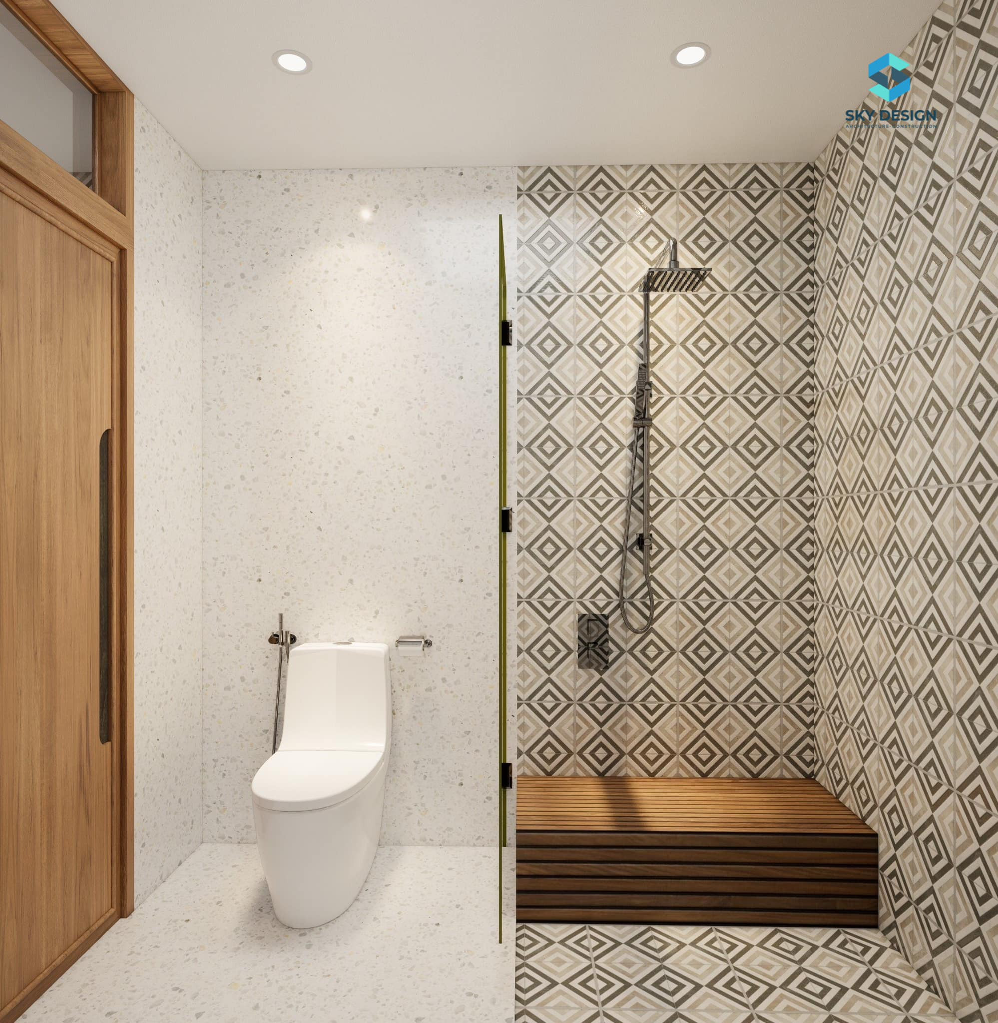 Phòng vệ sinh tầng 1, anh Hiển đưa bồn rửa mặt ra ngoài để mọi người thuận tiện sử dụng, phía trong là bồn cầu, khu tắm ướt kết hợp phòng xông hơi.
