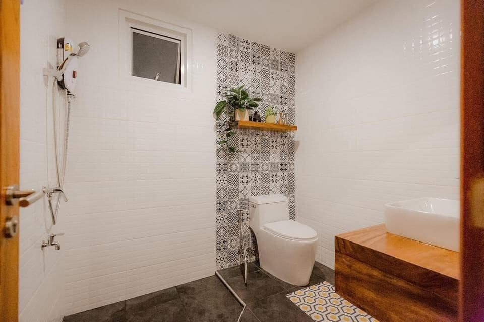 Bên cạnh đó, phòng vệ sinh chính được thiết kế thành nơi thư giãn, có bồn tắm nằm bên khung cửa sổ lớn.