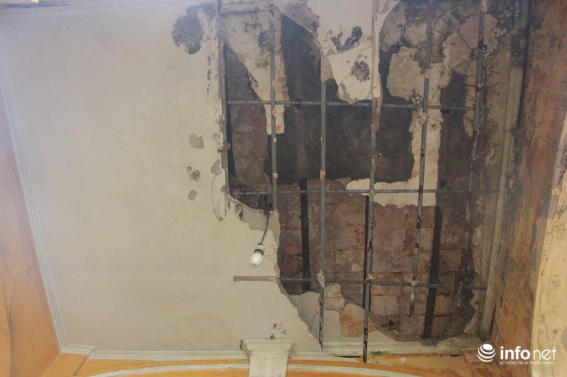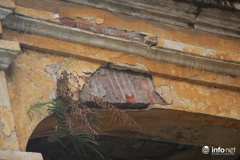 Các mảng tường đã bong ra, lộ hết toàn bộ gạch bên trong 1 thanh giầm ngang mái vòm nhà.