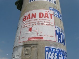 Dọc các con hẻm, ngõ ngách, thôn xóm, trên đường phố Quảng Nam... đều được căng đầy pa-nô, các tờ rơi rao bán nhà đất được dán đầy trụ điện, tủ biến áp, tường rào… thậm chí có người đứng phát cho người đi đường.