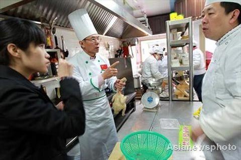 Li Chang, đầu bếp nổi tiếng ở Hồng Kông dạy nấu ăn tại nhà hàng dưới sự phiên dịch của một nhân viên khác