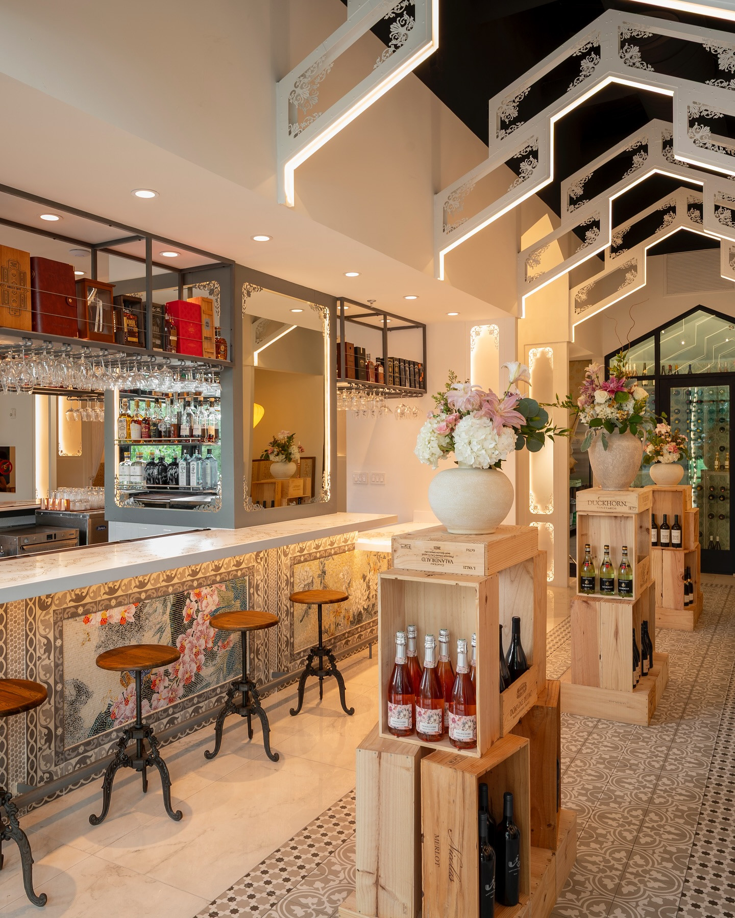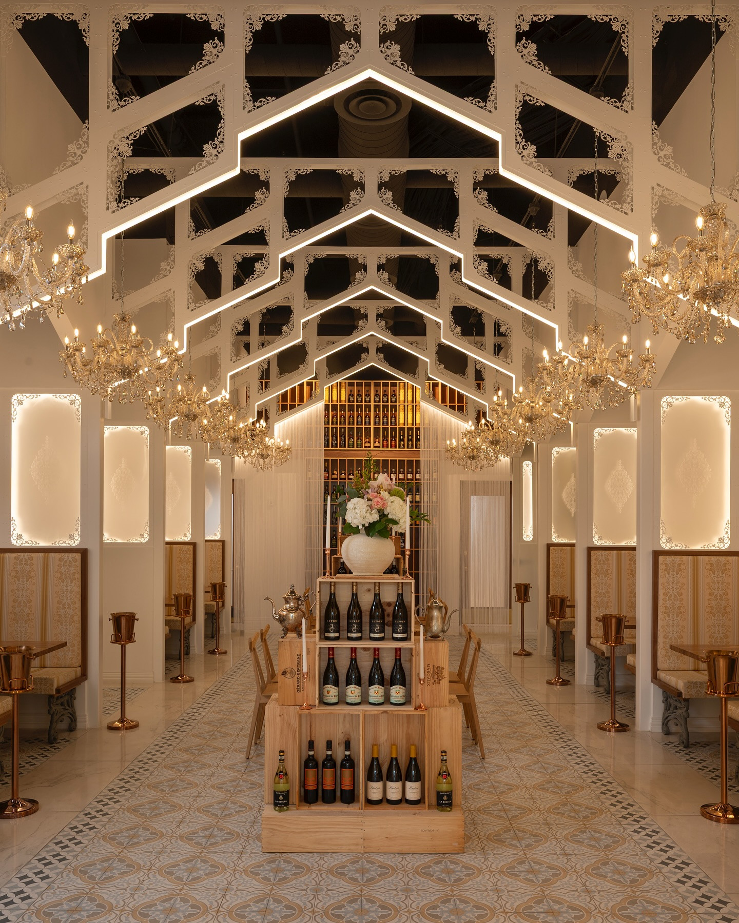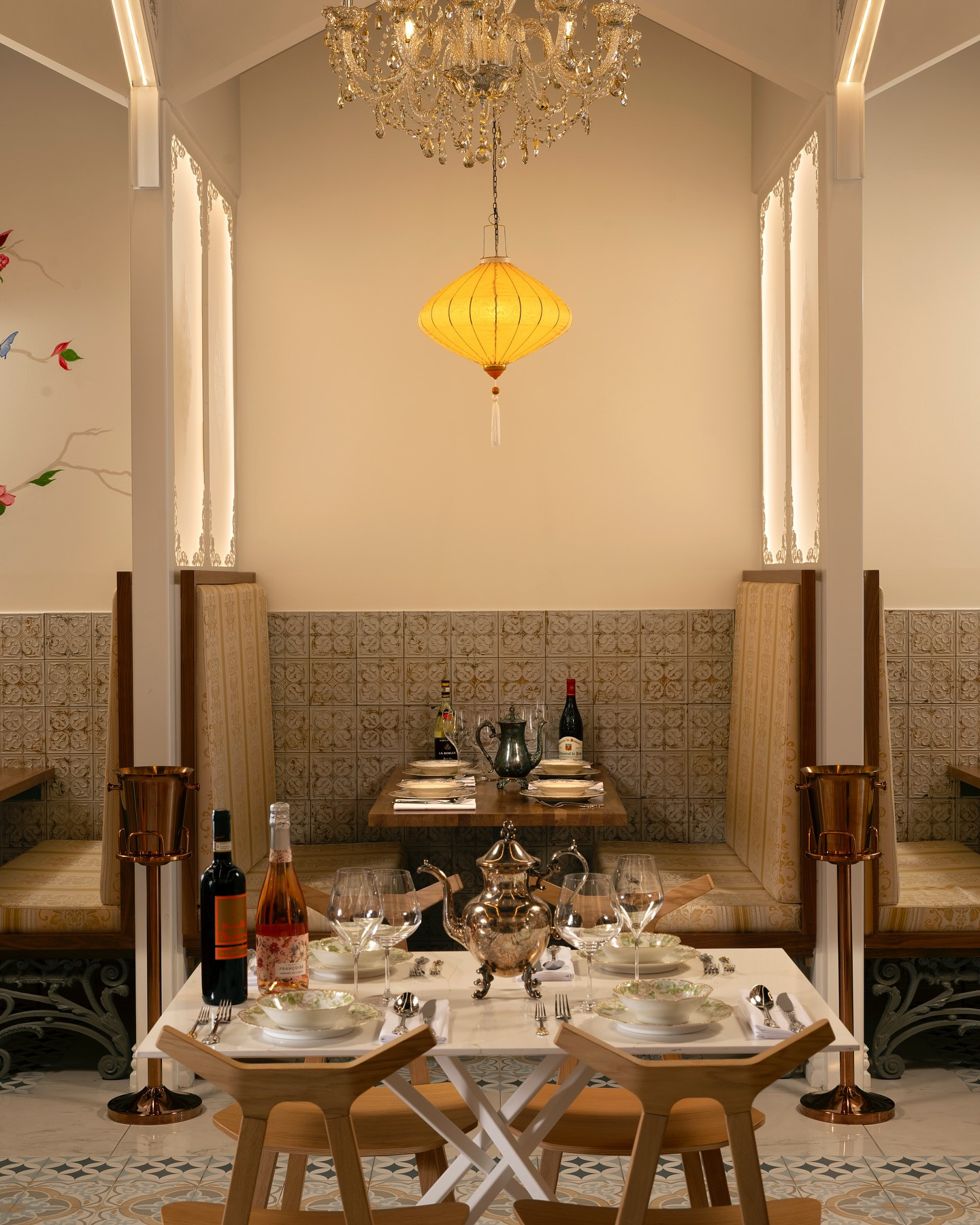 Chủ nhà hàng, ông Kinjo, cho biết ý tưởng thiết kế được lấy cảm hứng từ những nhà thờ cổ châu Âu, với tông trắng chủ đạo phủ trên trần cao, tạo cảm giác vừa sang trọng vừa thanh thoát.