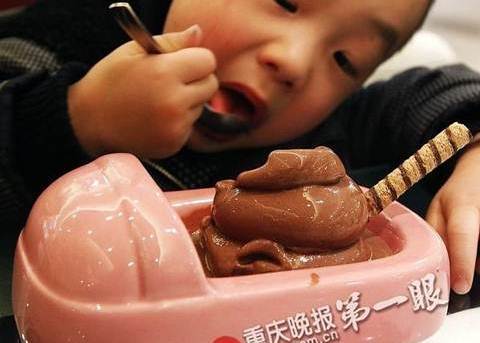 Một em bé đang thưởng thức món kem được đựng trong chiếc đĩa hình bồn cầu.