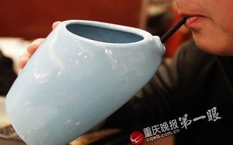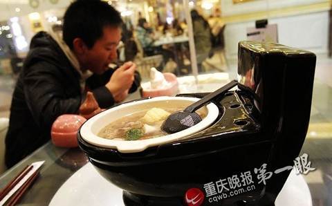 Đến cả món súp nóng hổi cũng được đặt trên chiếc bát có hình bồn cầu.