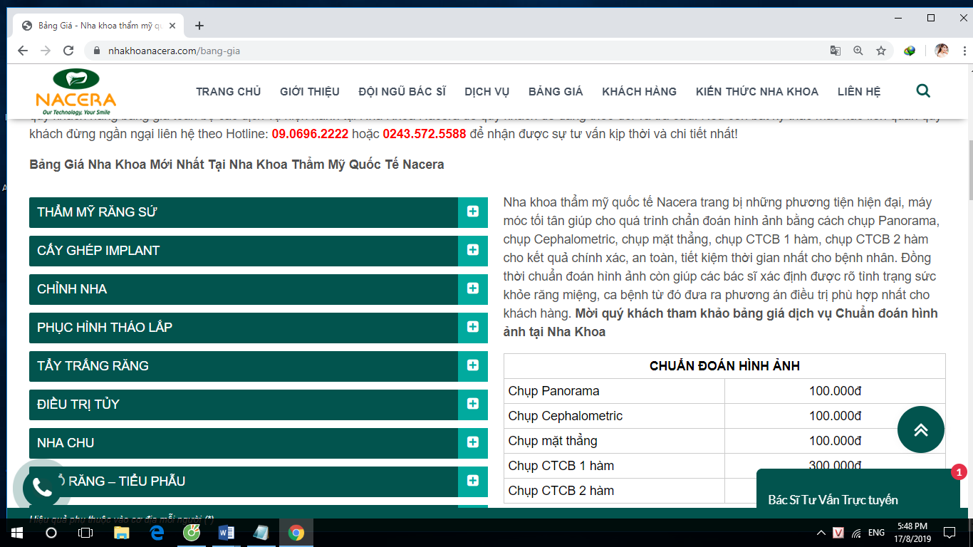 Bảng giá dịch vụ https://nhakhoanacera.com/bang-gia của Nha khoa Nacera (thời điểm ngày 19/8/2019 thể hiện cơ sở này khẳng định thực hiện chụp phim X quang.