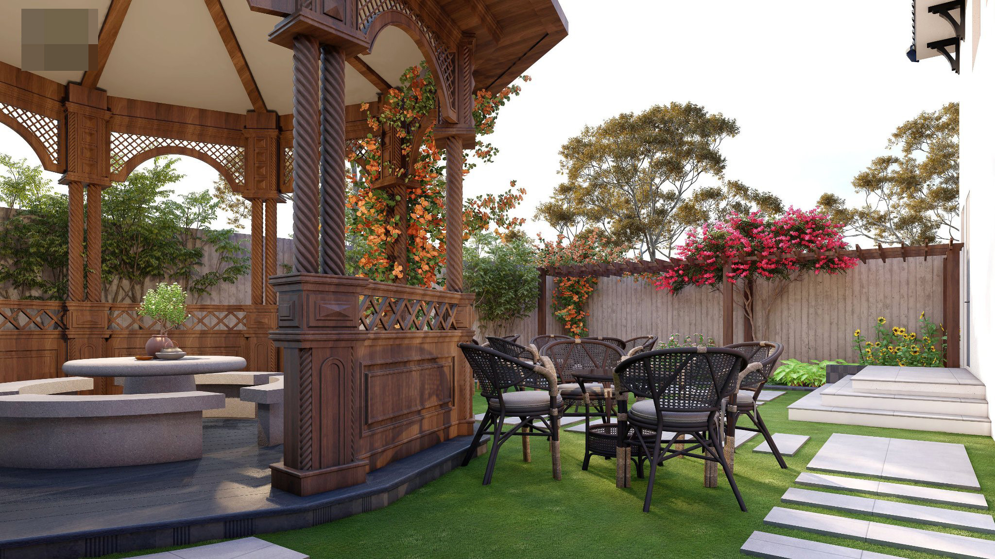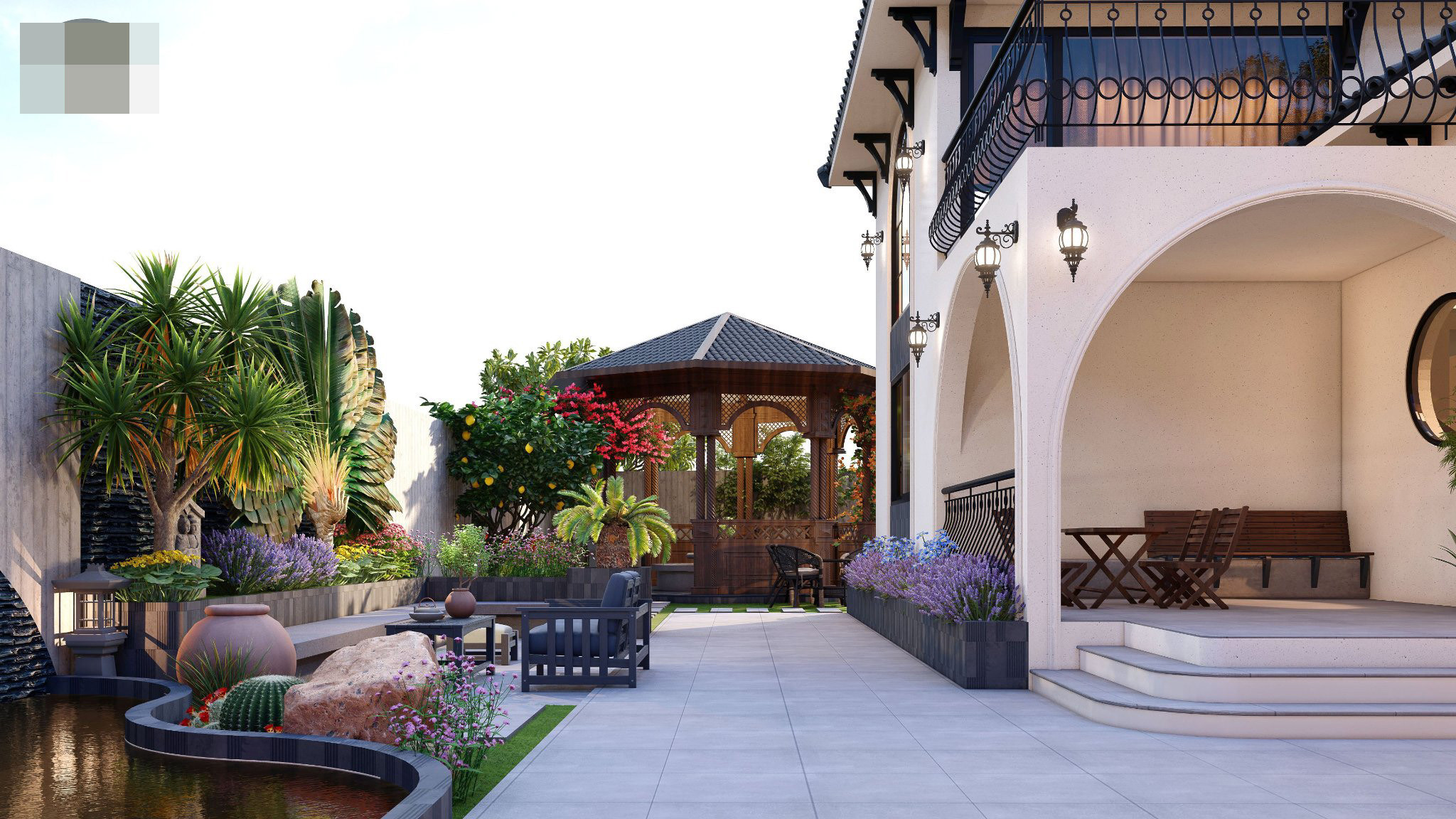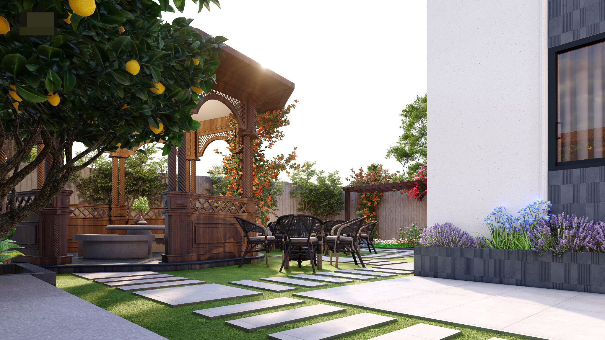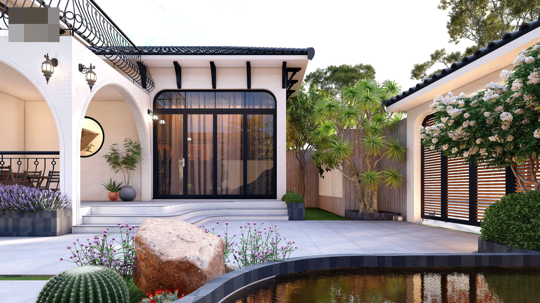 Sân vườn rộng rãi, tận dụng hướng Nam hút gió và hạn chế cái nóng từ hướng Tây.