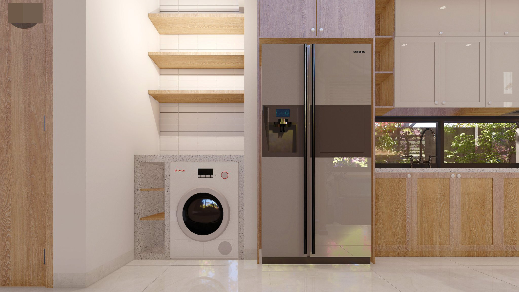 Khu giặt sấy nhỏ gọn nằm cạnh tủ lạnh và bếp.