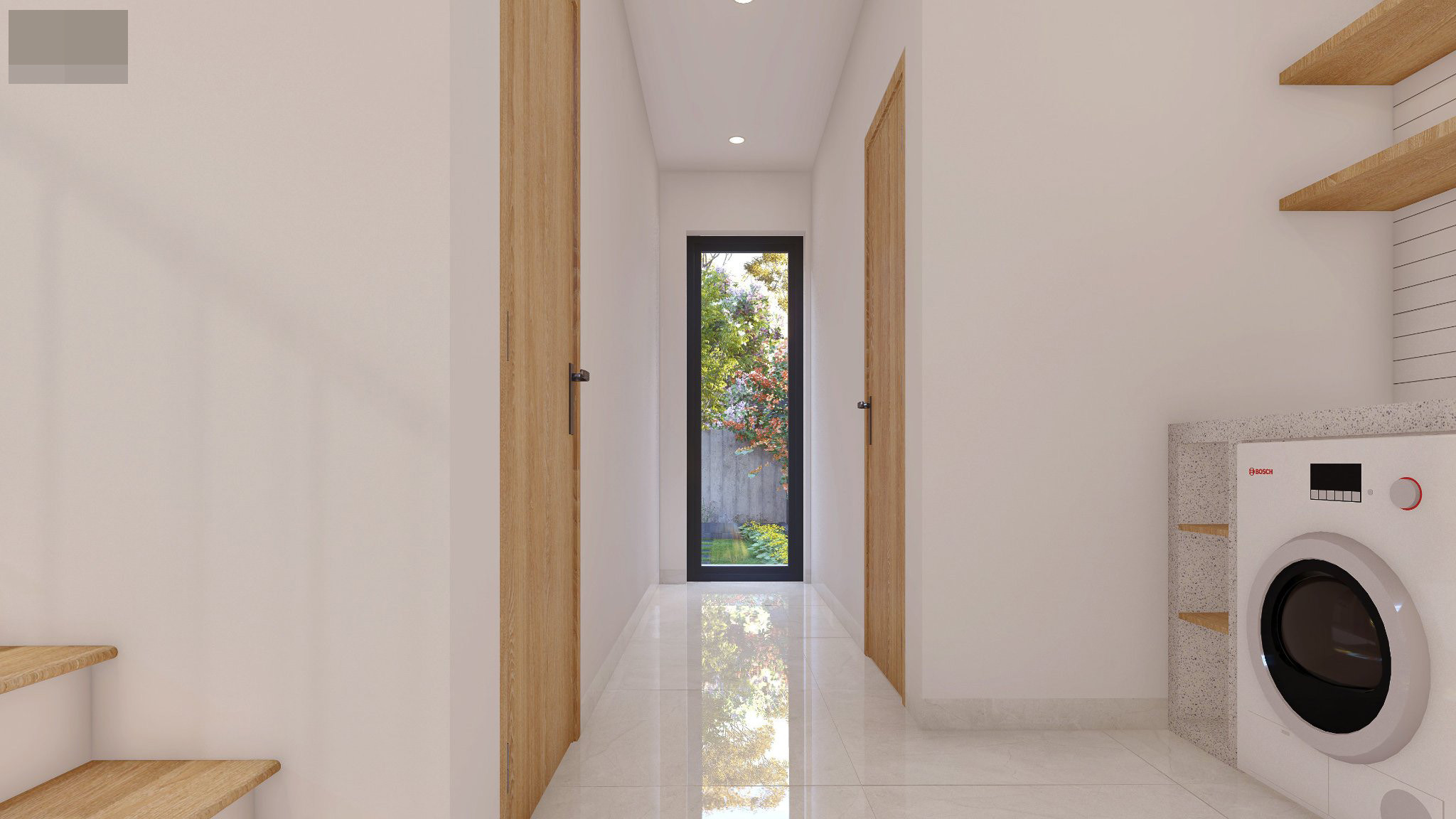 Ngôi nhà cũng có 1 khoảng hiên khá rộng và 1 khu vực mở thẳng ra khu vườn xanh theo đúng ý chủ nhà. Ngôi nhà giảm đến 80% nhu cầu dùng điện vào ban ngày, đồng thời cải thiện đáng kể hiệu suất nhiệt và sự thoải mái cho các thành viên.