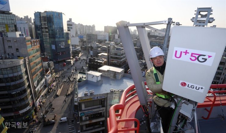 Nhân viên LGU+ lắp trạm gốc 5G tại Seoul, Hàn Quốc ngày 12/2. Ảnh: Korea Times |