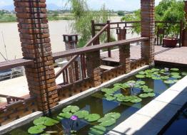 Toàn bộ nước thải sinh hoạt và vệ sinh thu vào bể chứa đặt tưới tầng 1. Do Hội An có mùa lũ, nhà lại ở ven sông nên toàn bộ bể xây nổi trên mặt đất, cao hơn 2m so với nền nhà. Bể chứa có diện tích 15m2, ngăn thành 7 bể lọc xử lý. Nước thải xử lý xong được bơm ngược lên mái và cấp vào các bể cá, thả sen nước trên mái tầng 2, tầng 3