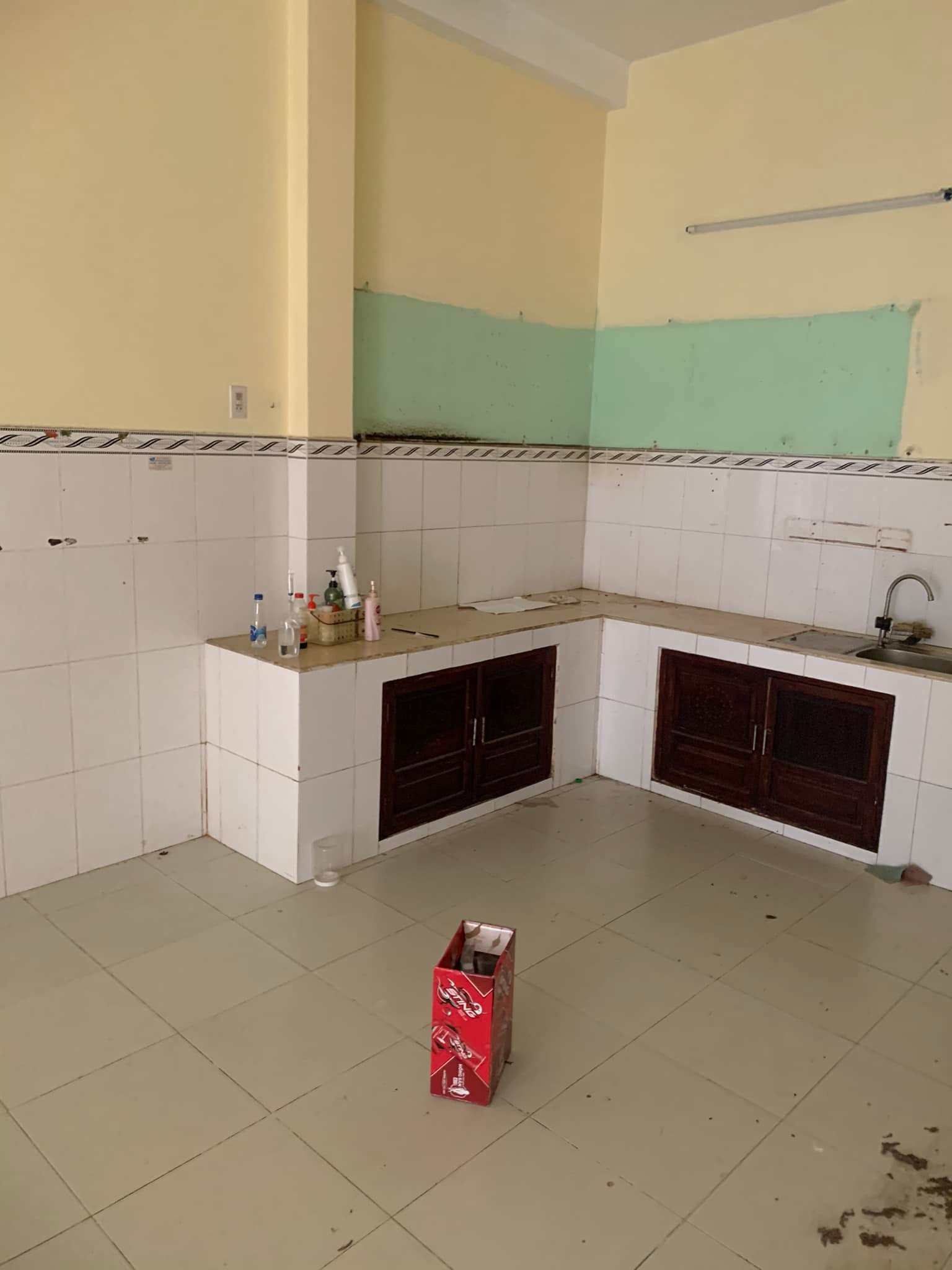 Hiện trạng nhà trước khi cải tạo khá cũ, thiếu thẩm mỹ. Do tường bị ngấm ẩm nên chủ cũ dùng giải pháp ốp gạch lên tường khiến không gian khô cứng, thiếu sức sống.