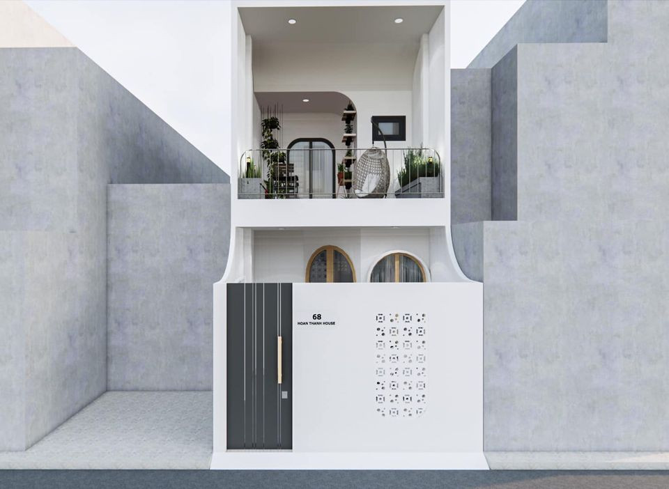 Anh Đạt Nguyễn dùng gạch bông và bờ tường bo cong làm điểm nhấn cho mặt tiền. Ban công tầng 2 biến thành góc chill, thư giãn, có xích đu mây và cây xanh mát mắt. Bồn cây anh sử dụng loại bê-tông dẻo, tránh nước ngấm xuống nền, thời gian thi công nhanh hơn bồn xây gạch.