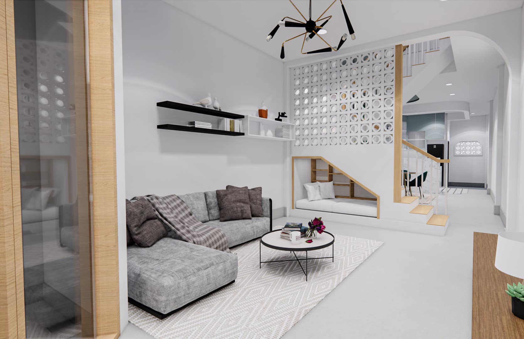Cầu thang ngăn cách bếp và phòng khách. Gầm được bố trí làm thành ghế tựa ngả lưng khá dễ chịu, bên trong còn có kệ bày đồ decor nhỏ xinh. Công trình mang tinh thần tối giản nên anh Đạt tiết chế nội thất.