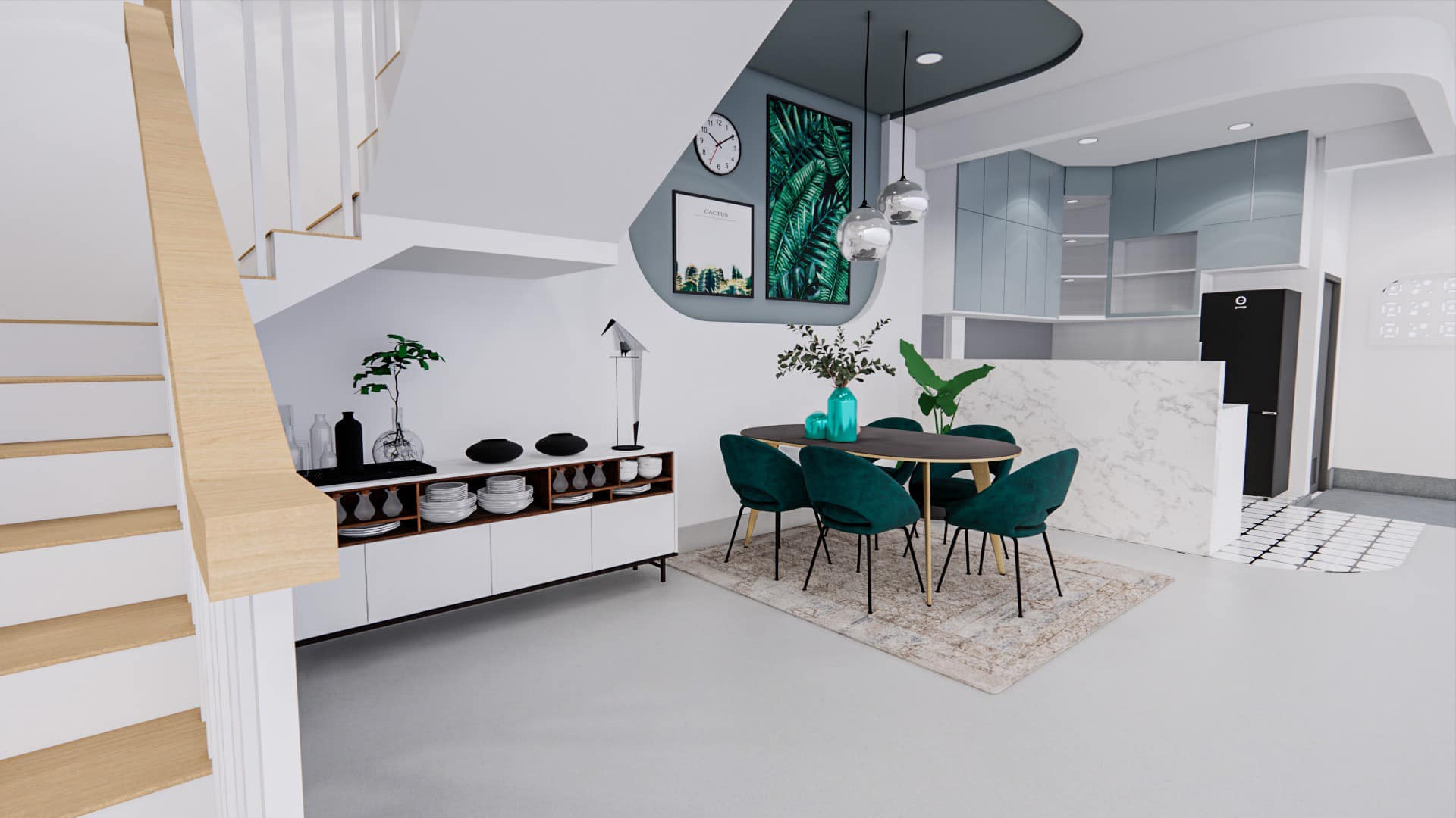Không gian bếp+bàn ăn điểm thêm màu xanh lá mang đến cảm giác gần gũi với thiên nhiên. Màu xanh lá có tác dụng điều hòa cảm xúc rất hiệu quả.