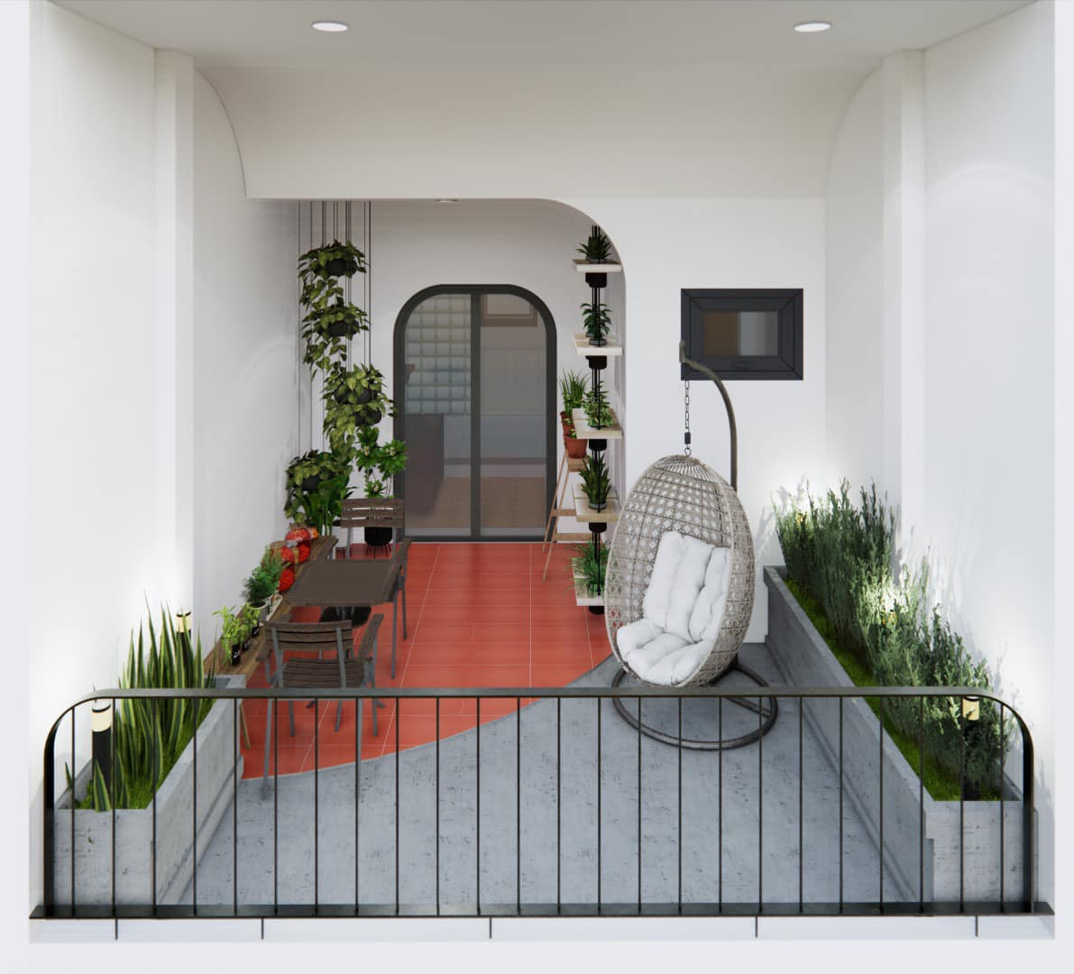 Vì là nhà nhỏ, nằm kẹt giữa hai nhà khác nên gia chủ chấp nhận hi sinh 1 phần diện tích tầng 2, tạo ra ban công lớn trồng cây, lấy sáng và cũng là góc "trị liệu" tâm hồn mỗi ngày. Ở đây kiến trúc sư dùng gạch đỏ kết hợp bê-tông mài để làm nổi bật và phân chia khu bàn uống trà với khu trồng cây. Hệ cây leo, cây cảnh nhỏ trên kệ phát huy tối đa tác dụng khi thiếu diện tích trồng cây.