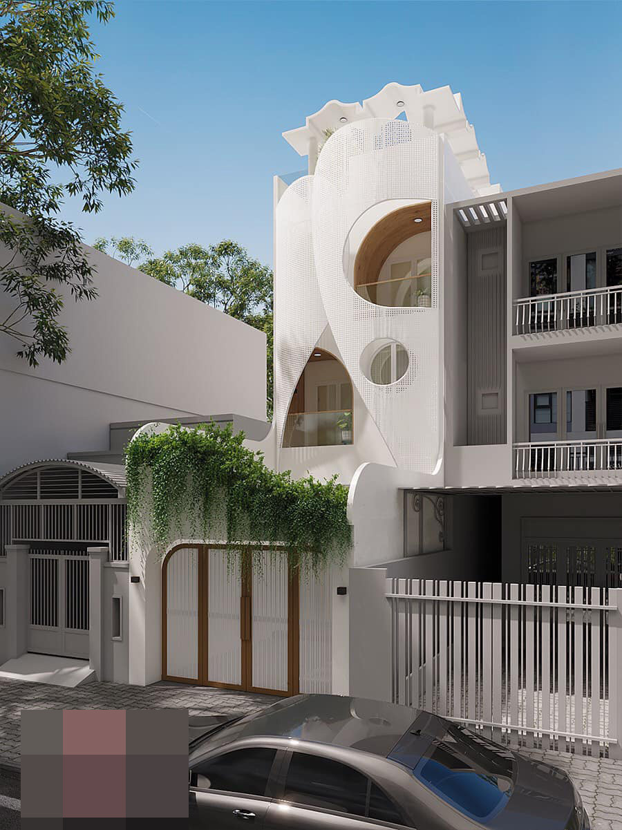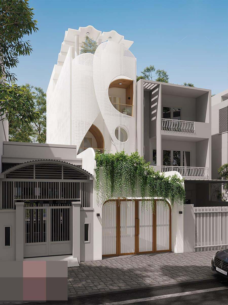 Kiến trúc độc đáo, hút mắt ngay từ mặt tiền. Mảng lam sắt sơn trắng uốn cong vừa cản nắng cho nhà, vừa có tác dụng làm đẹp.