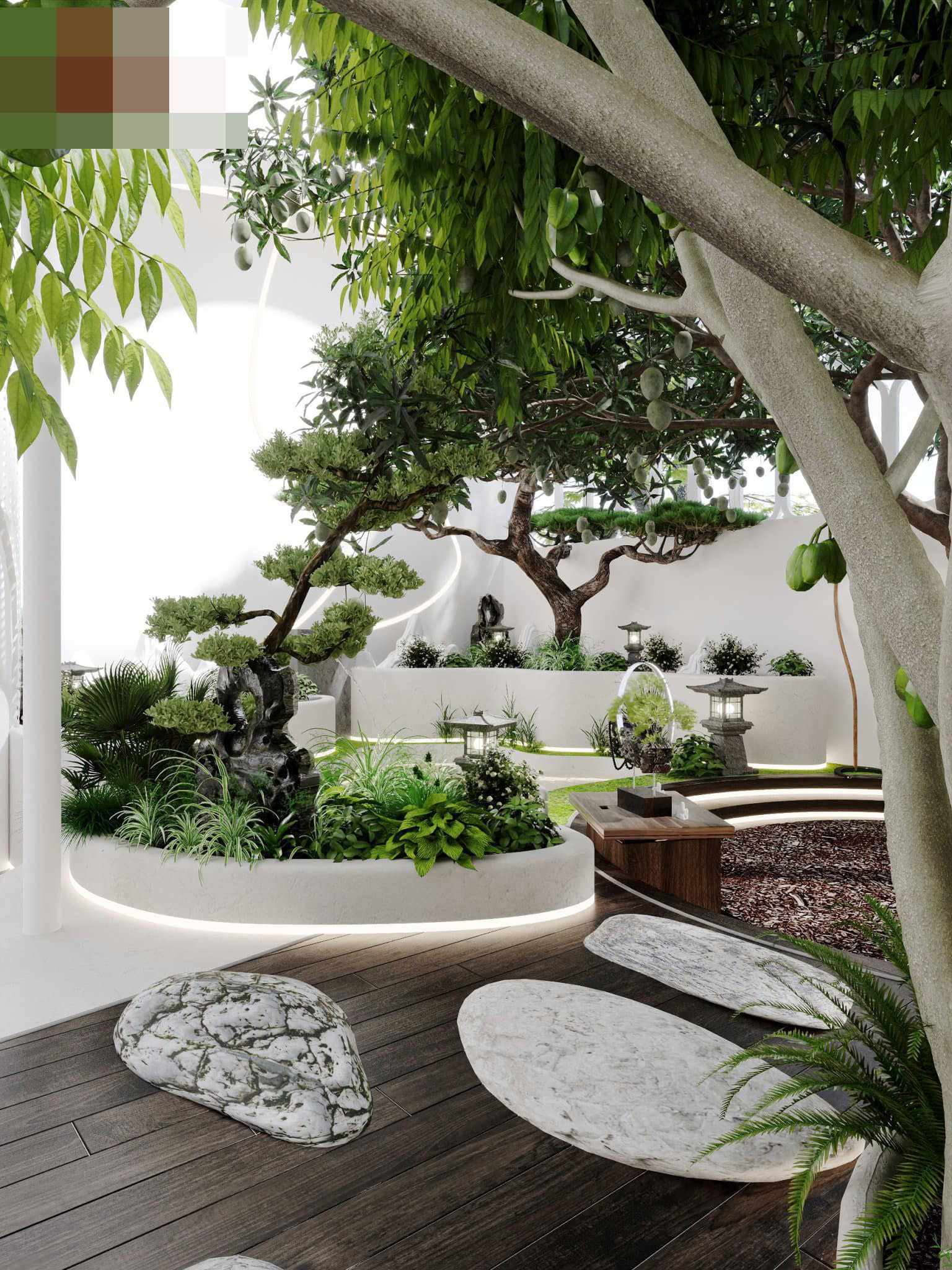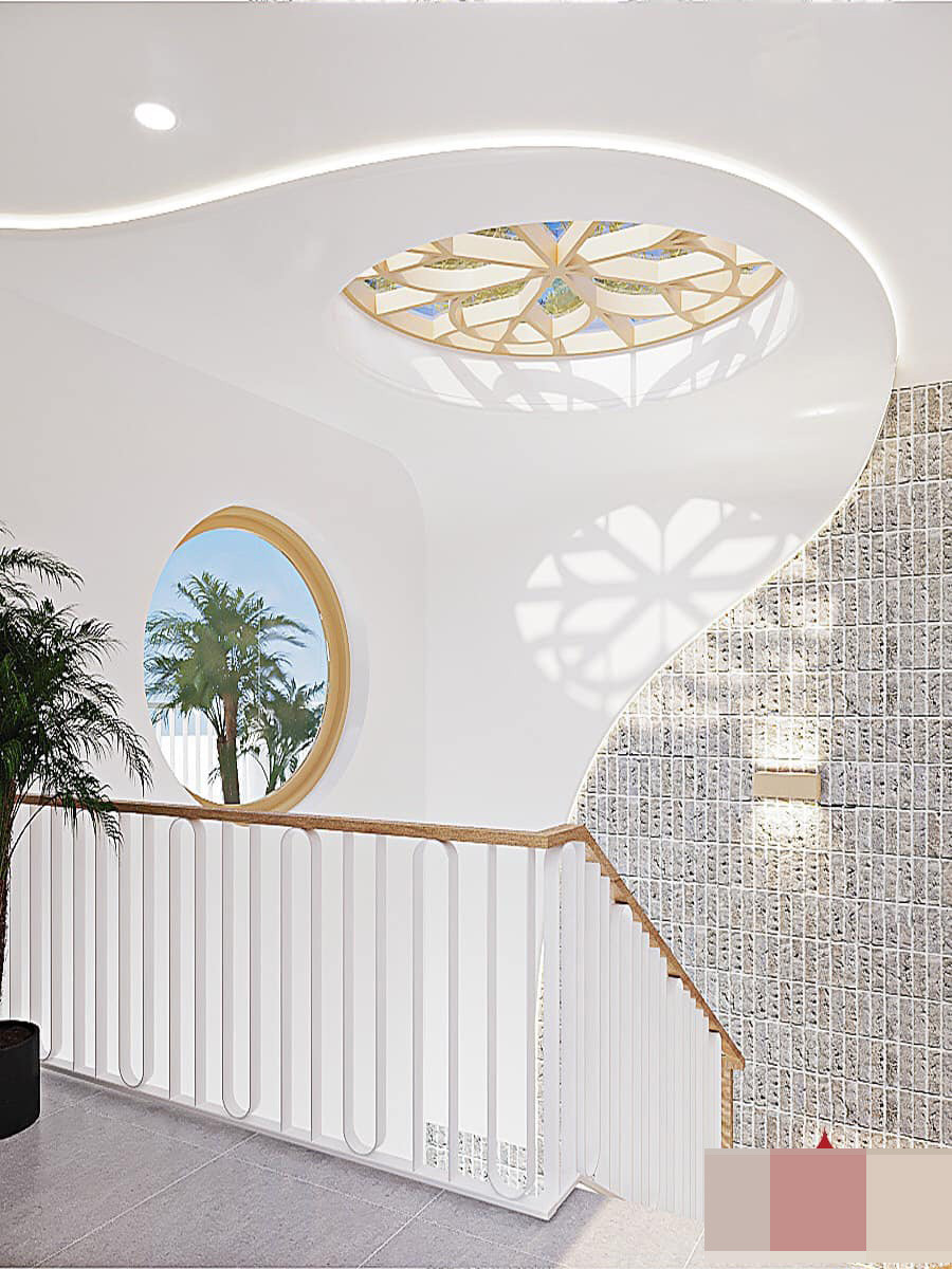 Một vẻ đẹp khó hòa lẫn trong các thiết kế của anh Quý, mảng xanh bố trí khoa học, ngoài cây cảnh nghệ thuật còn có cây ăn quả. Đây chính là khu vườn trên sân thượng, được anh dành khá nhiều công sức sáng tạo, đảm bảo mang tính ứng dụng cao cũng như dễ dàng bảo dưỡng sau thời gian sử dụng. Bản hòa ca của kiến trúc, thiên nhiên. Nơi đây khá rộng, gia chủ có thể tổ chức những bữa tiệc ngoài trời hoặc đón giao thừa cùng gia đình bên ấm trà nhỏ. Cầu thang tầng 1 dẫn lên các tầng, bậc thang gắn đèn led âm sang trọng. Nhà mang màu chủ đạo là trắng nên sàn gỗ dùng màu tối, rất nổi bật.