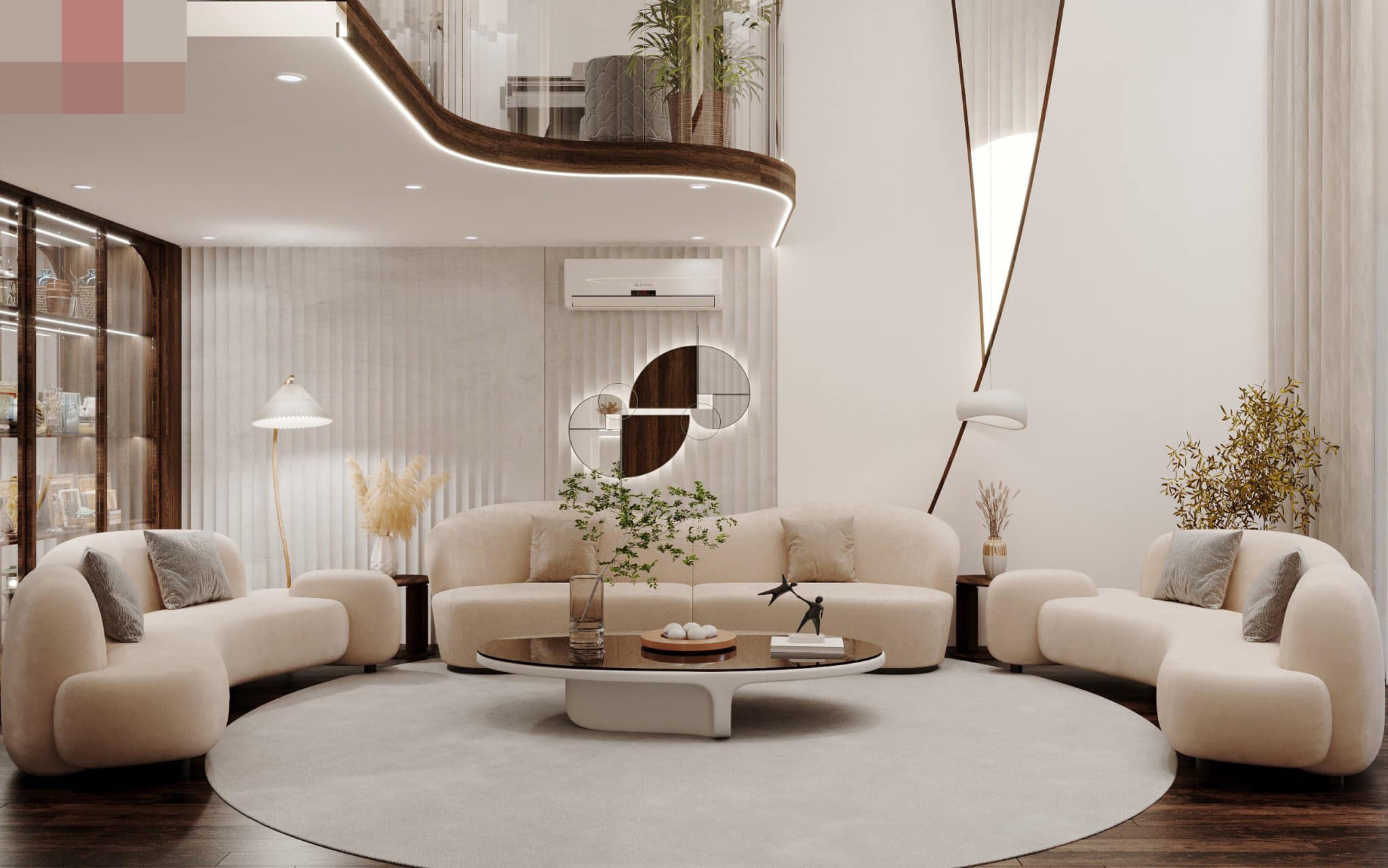 Phòng khách chính nằm ở trung tâm của nhà, phía trên là khoảng thông tầng cao ráo, thoáng đãng giống thiết kế penthouse.