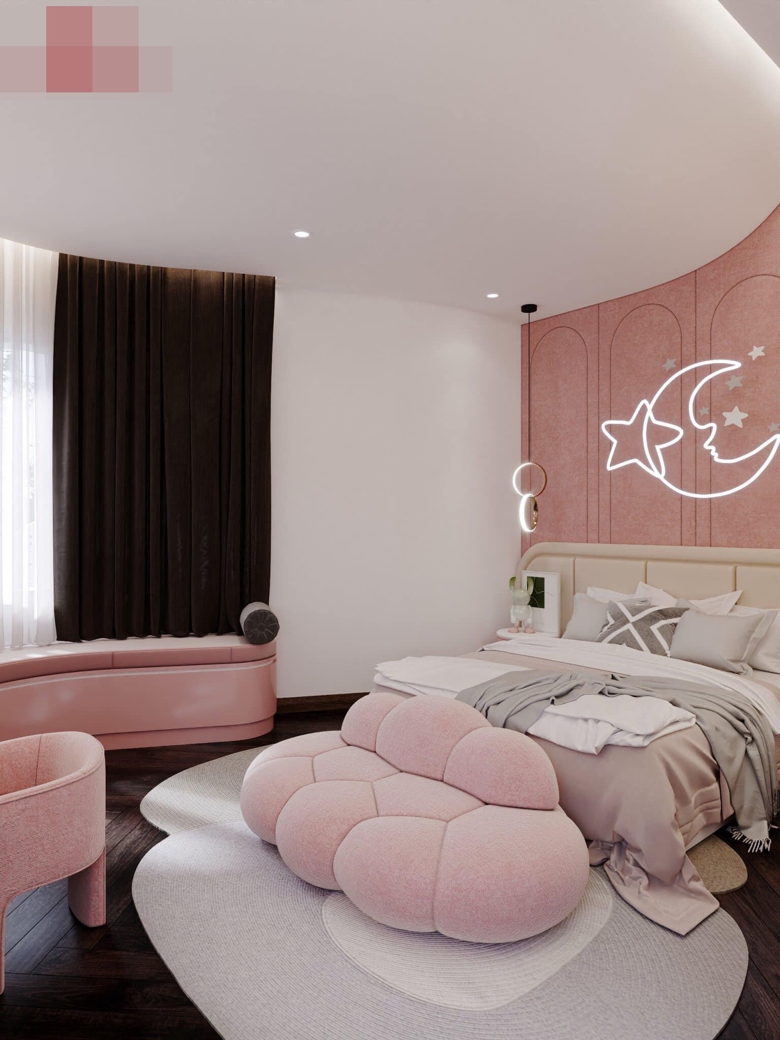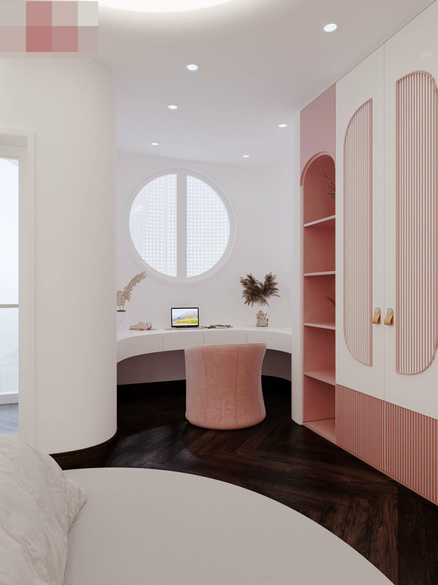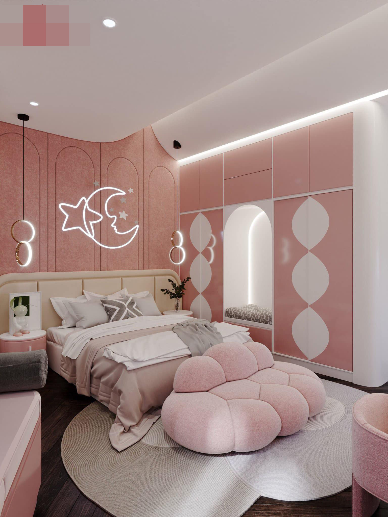 Phòng ngủ bé gái dễ thương màu hồng, ấn tượng và điểm nhấn của phòng chính là chiếc ghế văng êm ái giống cục bông. Tủ quần áo ngoài chức năng chứa đồ còn là góc ghế đọc sách thú vị.