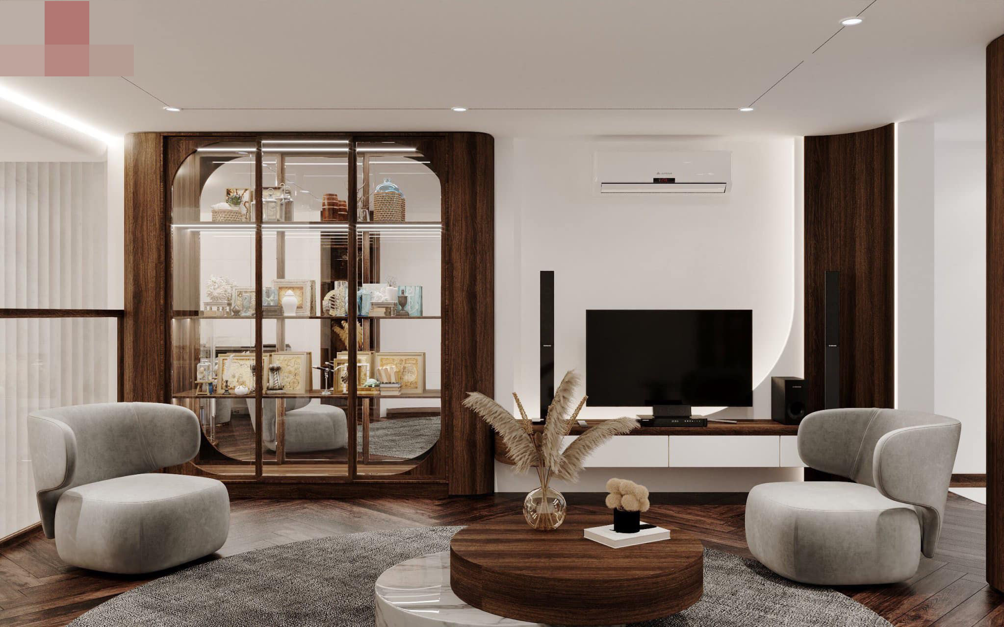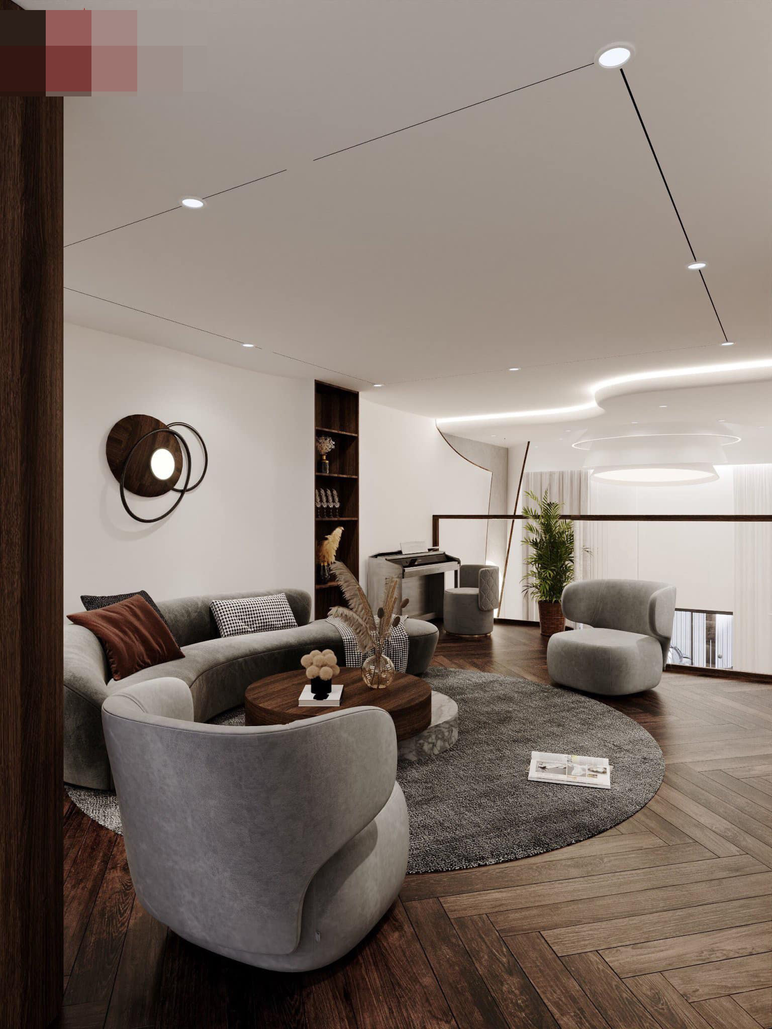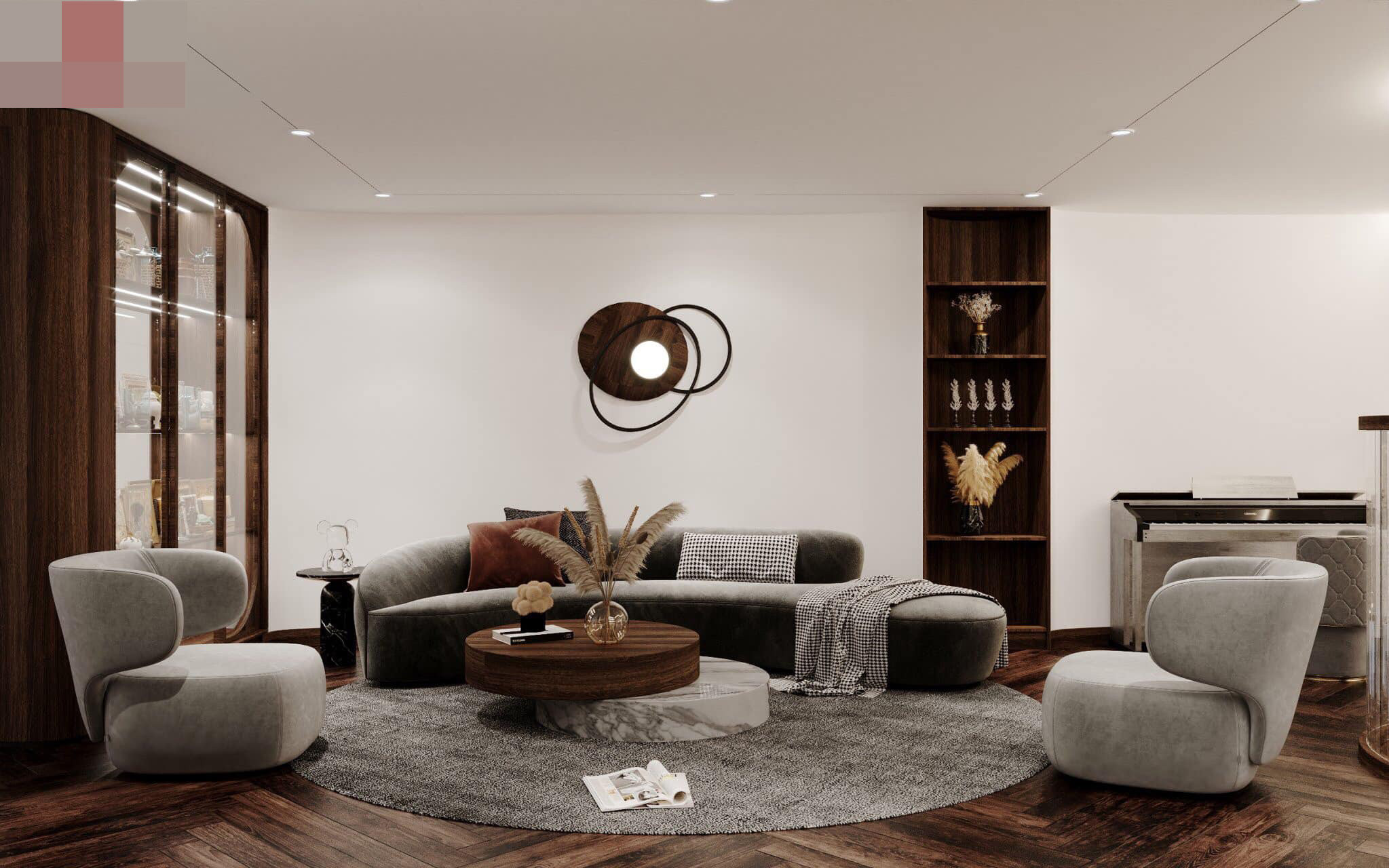 Phòng sinh hoạt chung ở tầng lửng mang màu xám và nâu trầm.