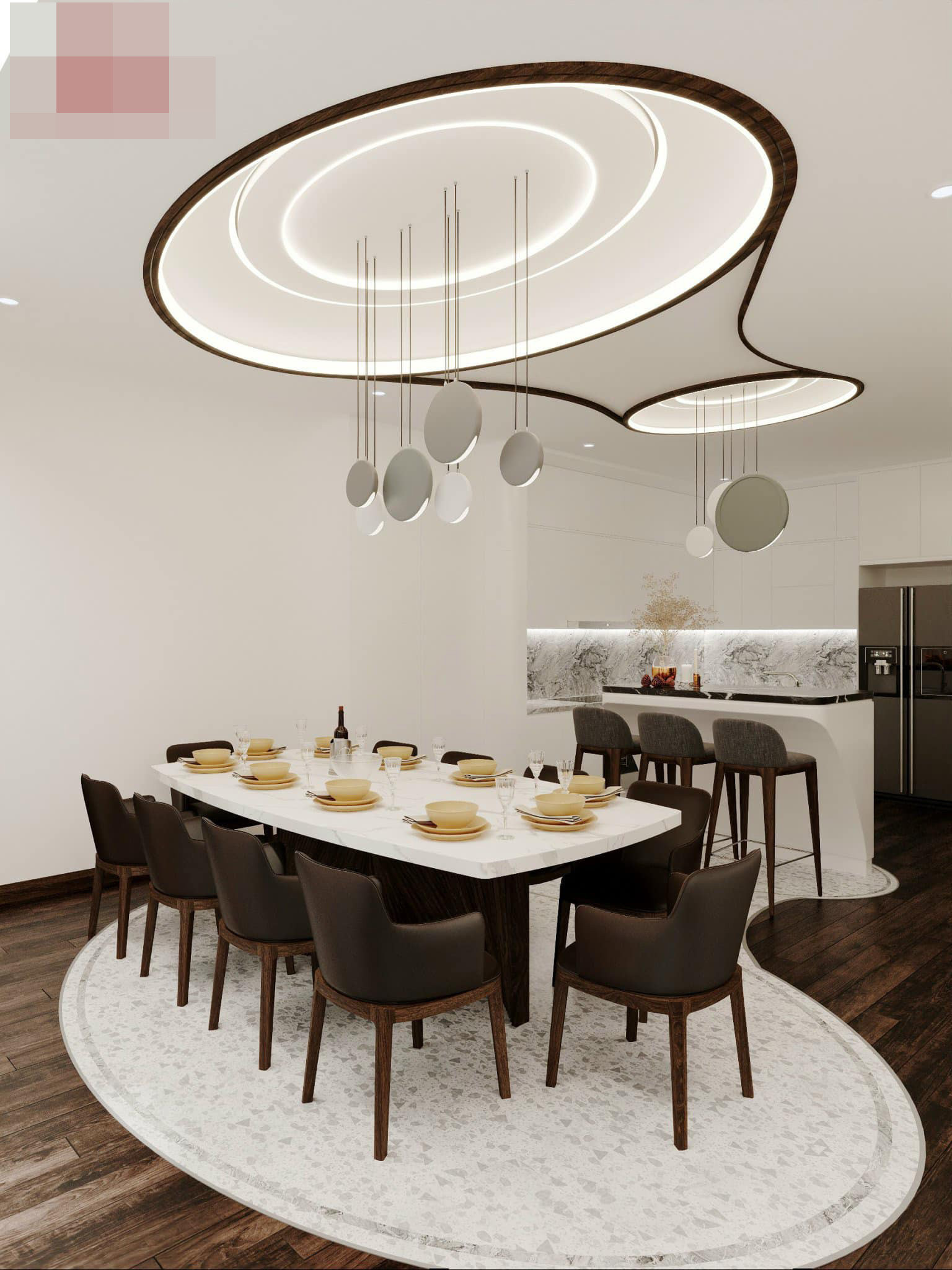 Phòng bếp+bàn ăn tinh tế, dễ chịu. Mảng đèn led tạo cảm giác như giếng trời.