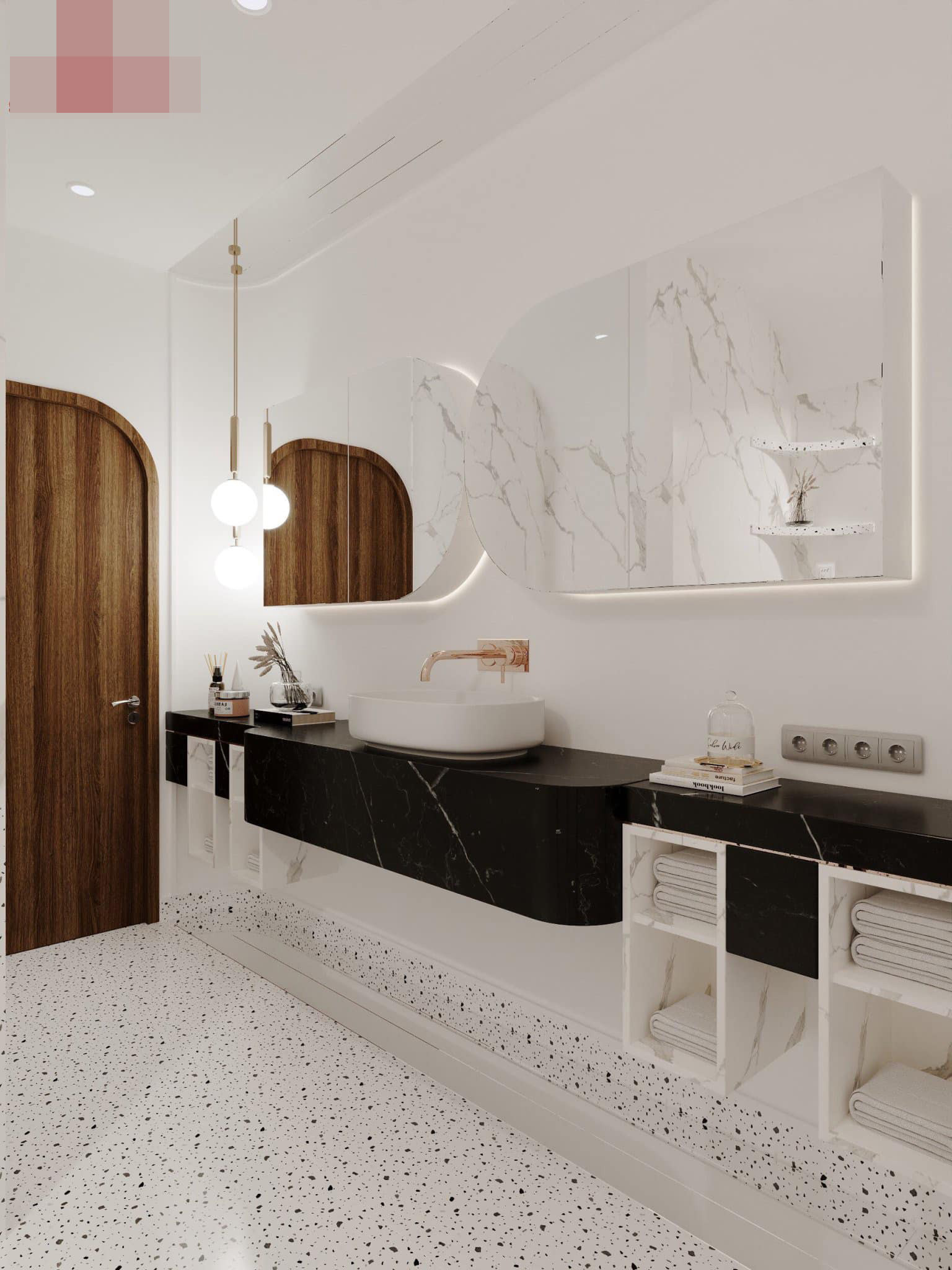 Phòng vệ sinh sang trọng, dùng hệ tủ ốp đá vân trắng tăng độ trang nhã cho không gian.
