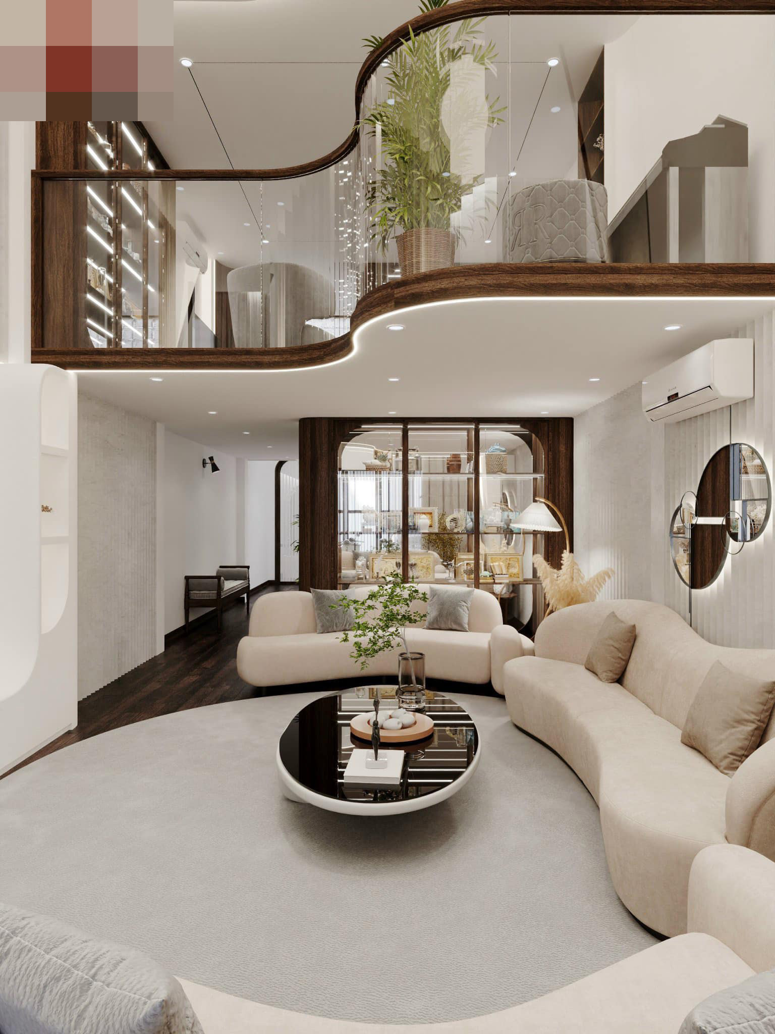 Khu vực gác lửng có tay vịn kính bo cong cầu kỳ, đòi hỏi tay nghề thi công cao.