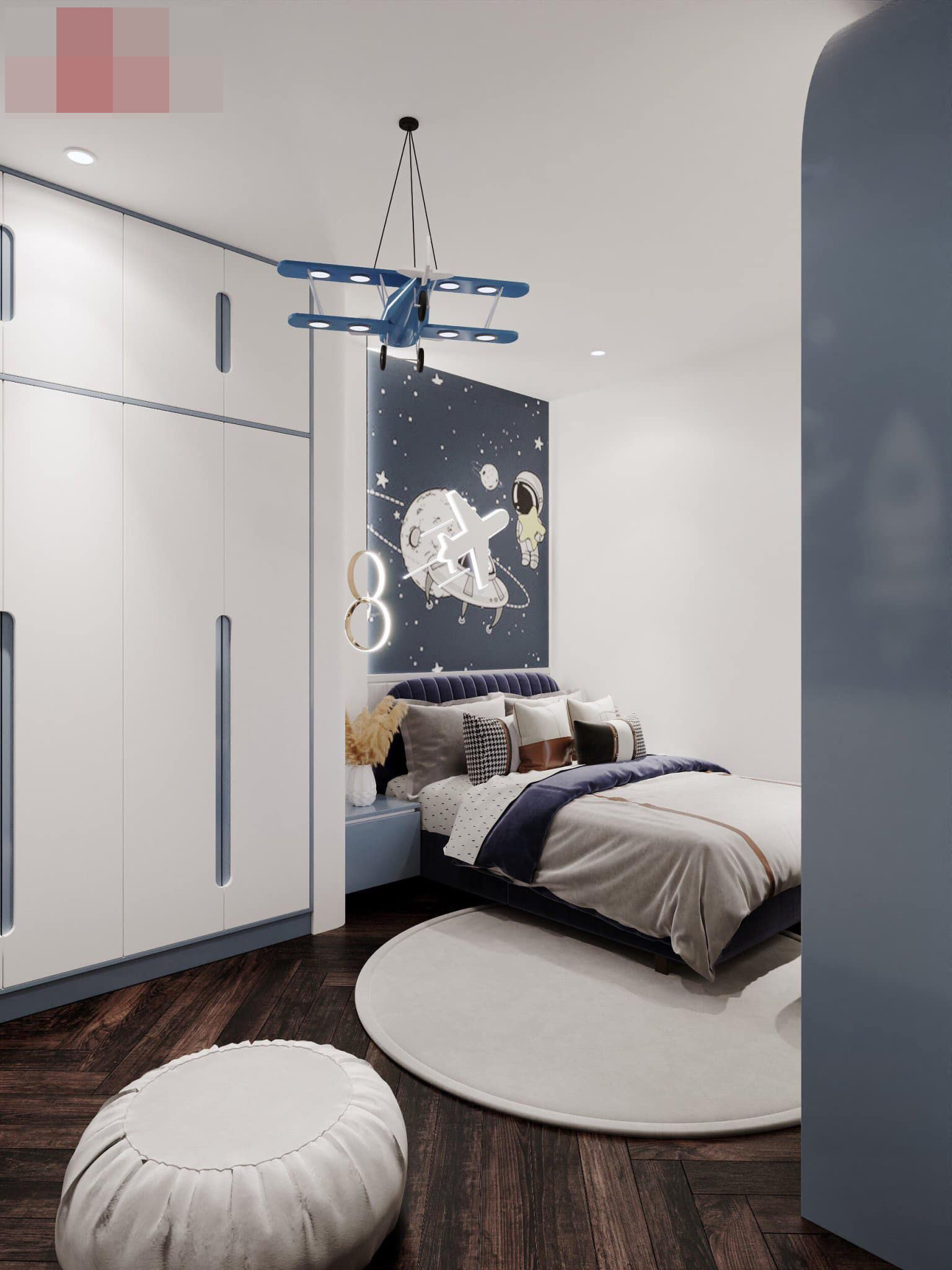 Phòng ngủ bé trai tông màu xanh với họa tiết phi hành gia phát sáng ở đầu giường. Ý tưởng khiến phòng thêm hấp dẫn, thú vị.