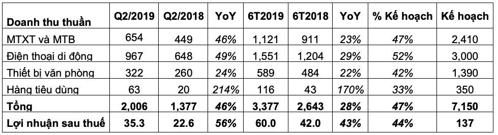 Ngành hàng máy tính xách tay & máy tính bảng đạt 1.121 tỷ đồng, tăng trưởng 23% so với cùng kỳ năm ngoái, hoàn thành 47% kế hoạch năm, vươn lên chiếm 30% thị phần so với mức 28% cùng kỳ năm 2018.