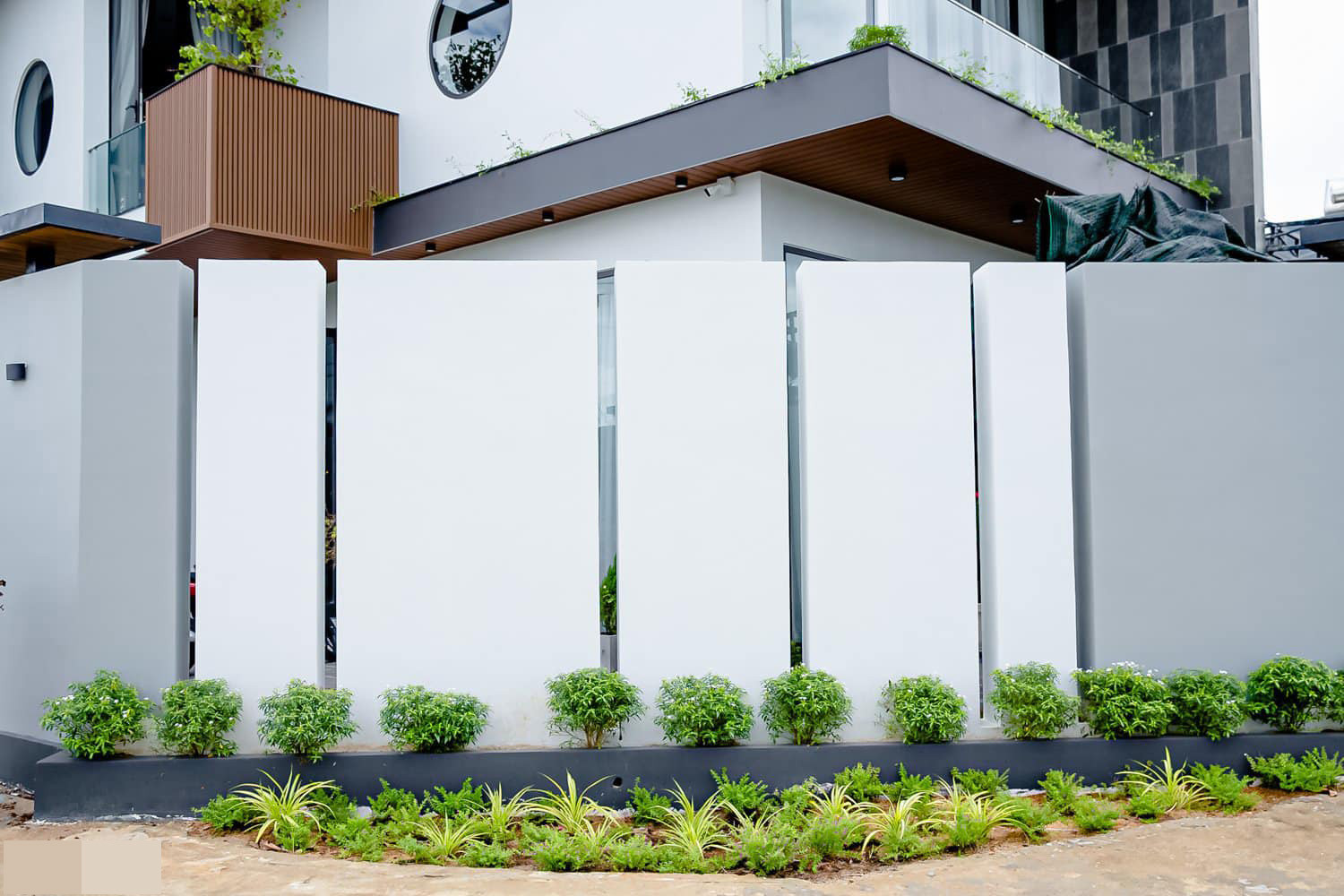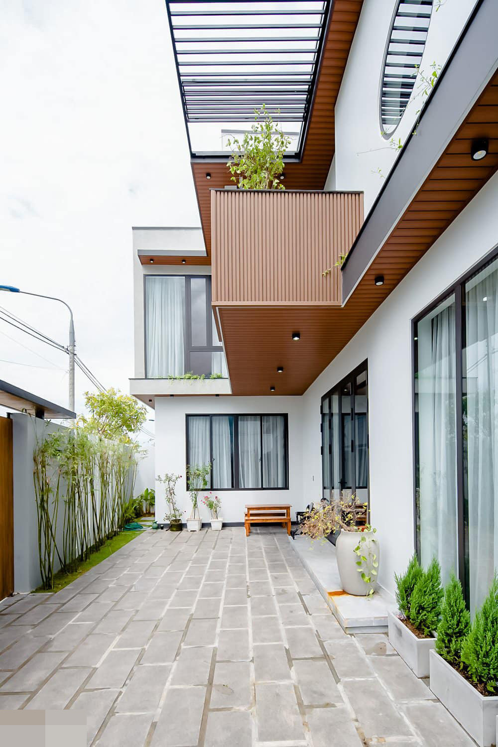 Mặt tiền và ngoại cảnh được chăm chút tỉ mỉ. Phần hiên nhà và hành lang ốp lam gỗ nhựa màu nâu vàng làm điểm nhấn. Những khung cửa tròn lấy sáng phảng phất chút truyền thống nhưng không làm mất đi sự trẻ trung của công trình. Cây xanh đưa đến cảm giác mát mẻ, trong lành.