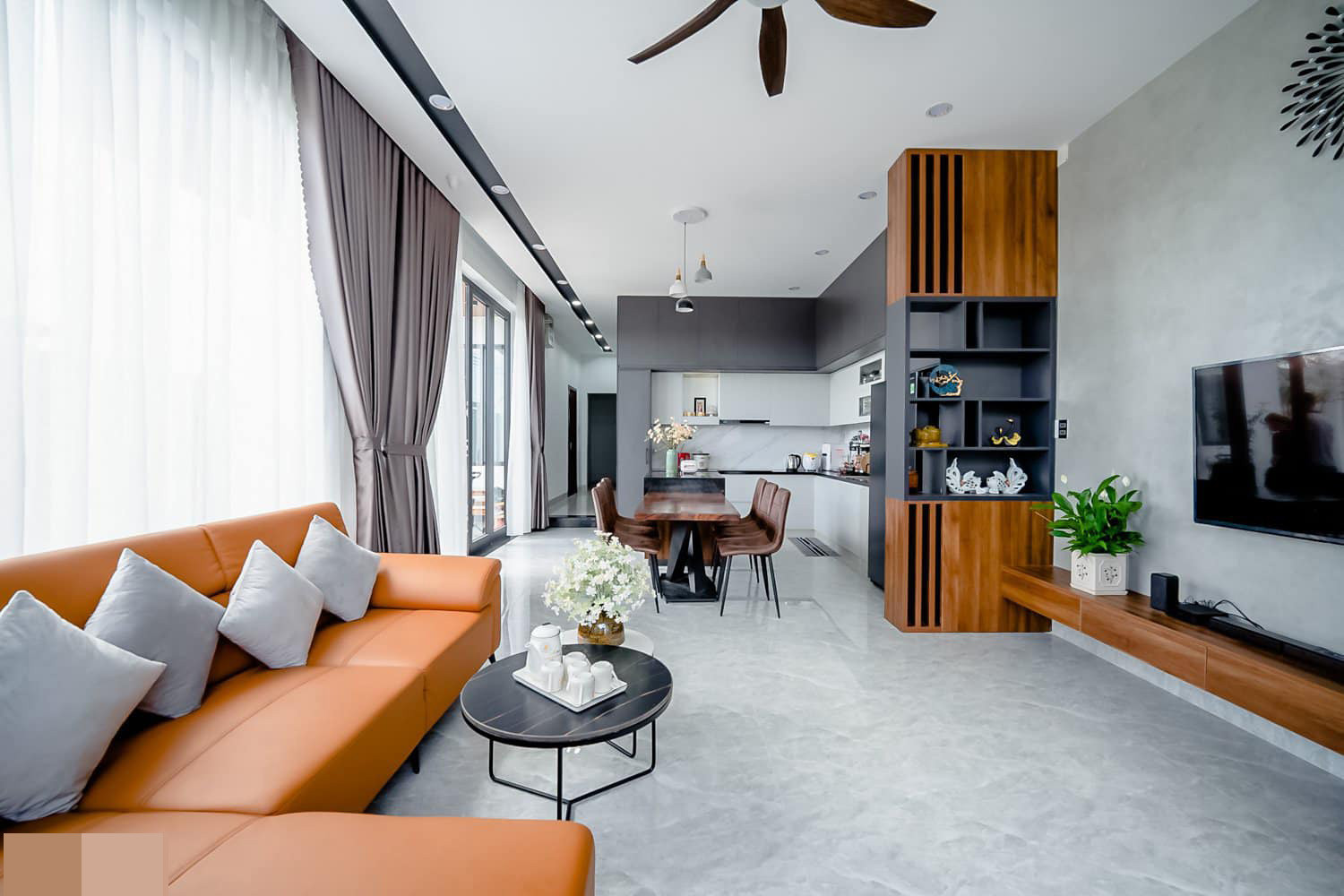 Phòng khách nhiều khoảng sáng nhờ tường kính và cửa kính lớn. Nội thất hiện đại kiểu Hàn Quốc. Sàn lát gạch bông sáng màu dễ vệ sinh và rất mát mẻ, phù hợp thời tiết nắng nóng ở Quảng Nam. Bên cạnh phòng khách là bàn ăn và bếp nấu.