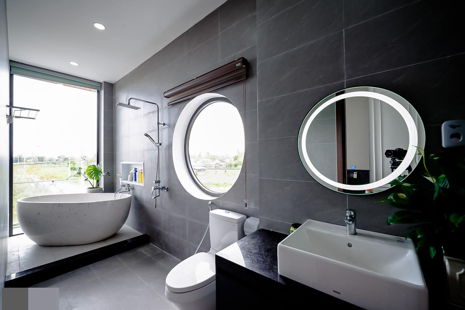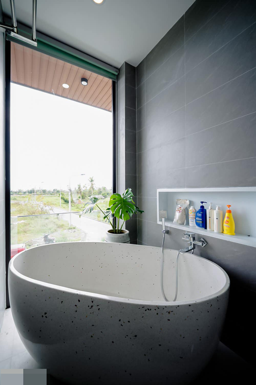 Từ bồn tắm có thể phóng tầm mắt ra khoảng không xa xa, giúp gia chủ giải tỏa những muộn phiền, căng thẳng trong tâm hồn.