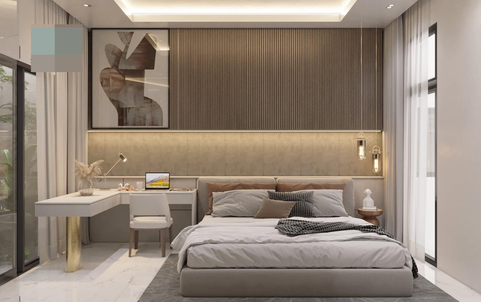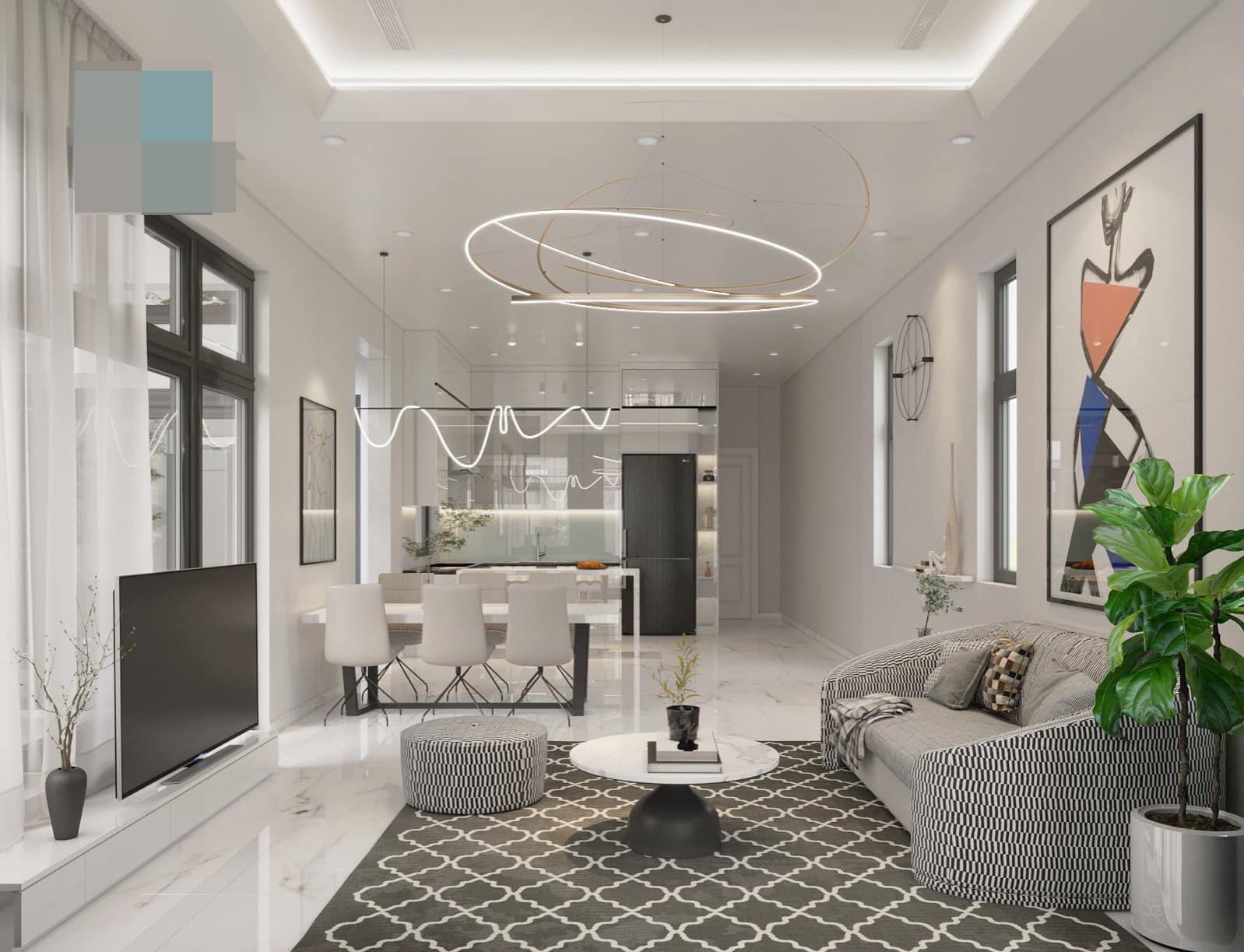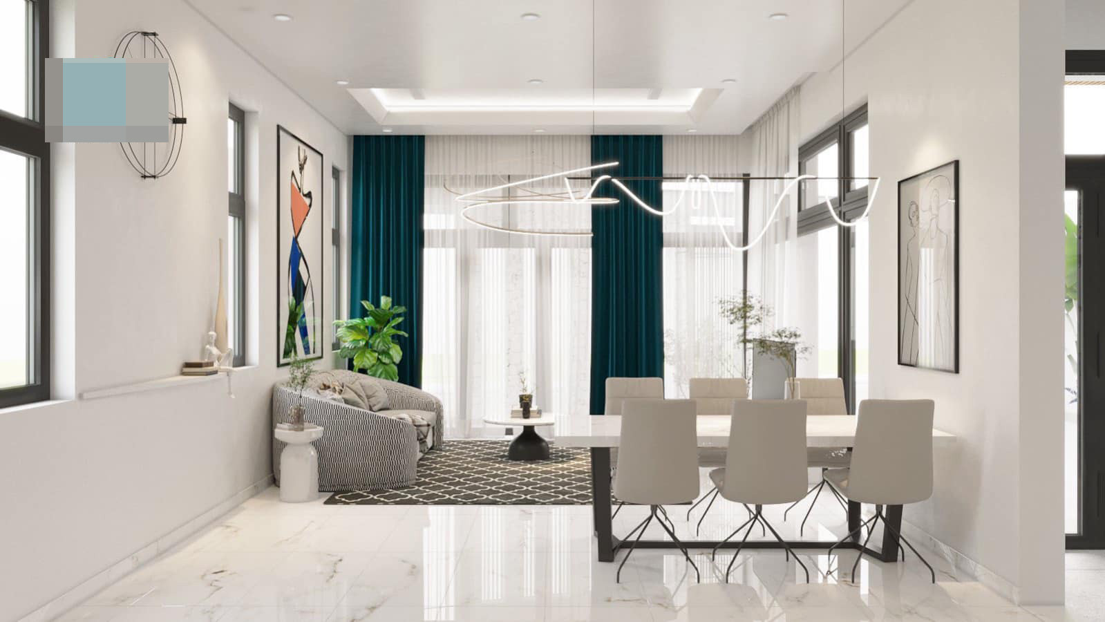 Nhà được thiết kế theo phong cách hiện đại, nổi bật với các sắc thái màu xanh dịu mắt từ cây cối kết hợp với hệ thống nội thất làm từ gỗ tự nhiên, đem đến không gian trẻ trung và ấm cúng cho gia đình trẻ.Công trình bao gồm 1 sân đậu xe ô tô, 3 ngủ, 3 vệ sinh, 1 sân thượng đa năng (phơi đồ, tổ chức tiệc BBQ...), 1 bếp+bàn ăn, 1 khách. Nhà có 2 khối, 1 khối 2 tầng và 1 khối 1 tầng. Khoảng sân được thiết kế để đáp ứng yêu cầu nghỉ ngơi, thư giãn của gia chủ. Về phần ánh sáng, các phòng công năng đa phần được thiết kế mở hoặc kết nối với nhau bằng hệ cửa kính trong suốt.Bên trong ngôi nhà, nội thất được thiết kế đơn giản, dùng hình họa ở tranh, thảm và đèn làm điểm nhấn.Khung cửa rộng đón tối đa ánh sáng. Bộ sofa và bàn ăn màu trắng giúp phòng khách không bao giờ bị lỗi mốt, luôn đẹp mãi với thời gianTiện dụng là một trong những tiêu chí được chú trọng trong quá trình xây dựng và hoàn thiện ngôi nhà. Điều này có thể nhìn thấy rõ ở khu vực bếp nấu ăn. Tất cả các chi tiết đều được sắp xếp một cách hợp lý, đáp ứng sở thích nấu nướng của gia chủ.