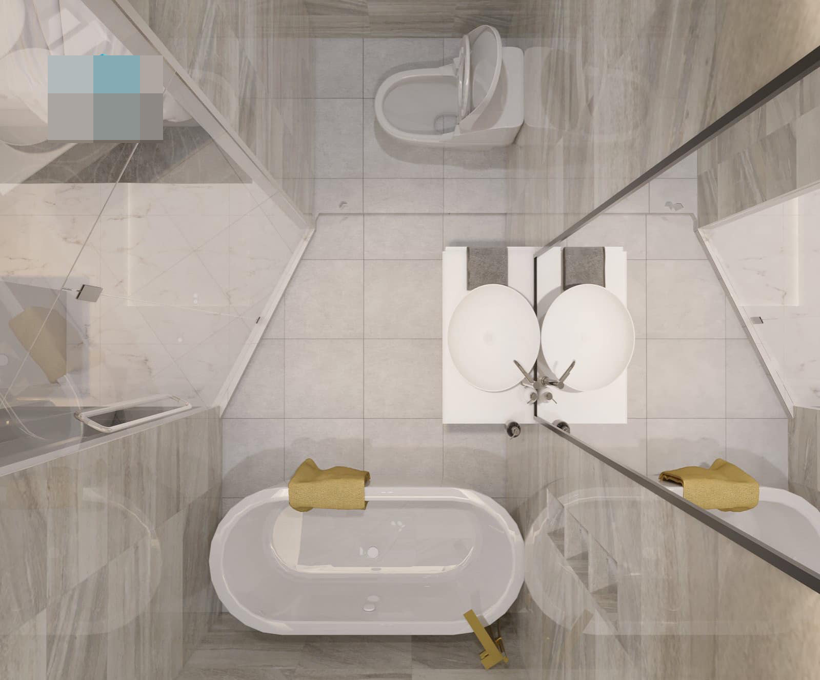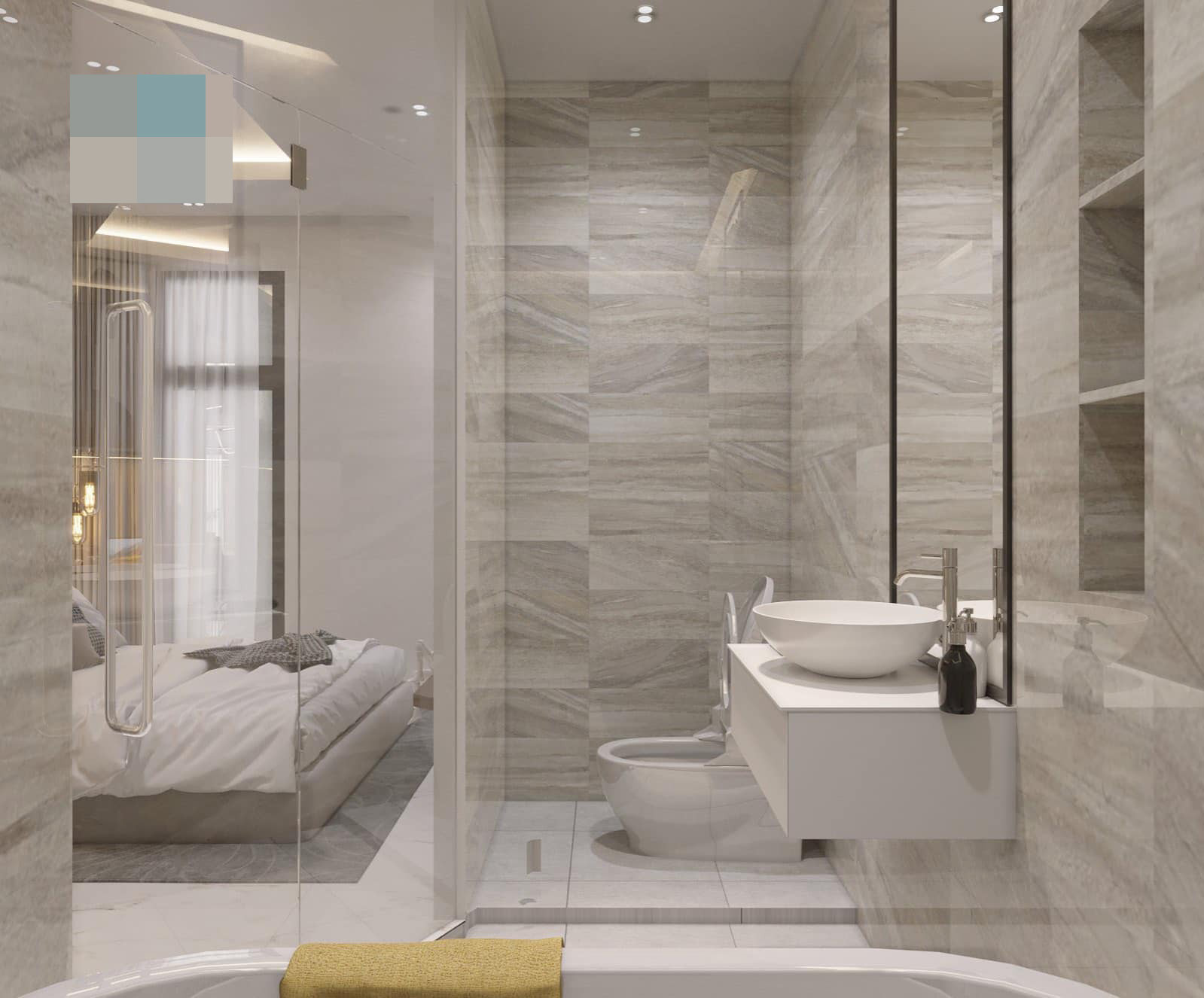 Phòng tắm sử dụng nội thất đá và kính, màu sắc giống phòng khách nhằm mang lại sự đồng nhất cho nhà.