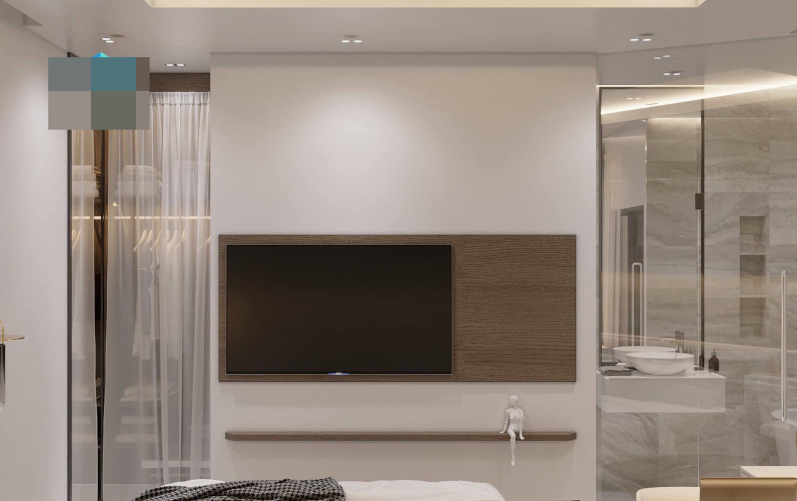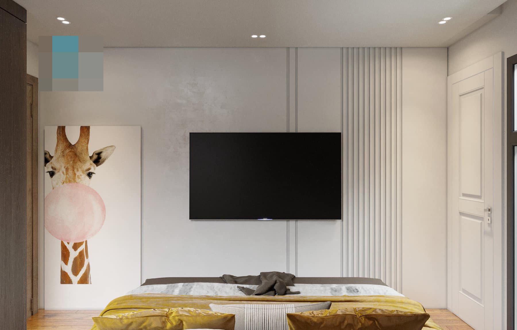 Phòng ngủ tone trắng, đối diện giường ngủ là kệ tivi siêu mỏng và cửa kính cao kịch trần. Kiến trúc sư Phan Hiển cho biết: "Cửa kính không chỉ là giải pháp cho vấn đề ánh sáng mà cũng là giải pháp được chúng tôi sử dụng để giữ ấm các phòng, khi đóng lại sẽ cản được gió lùa vào mùa đông lạnh giá".