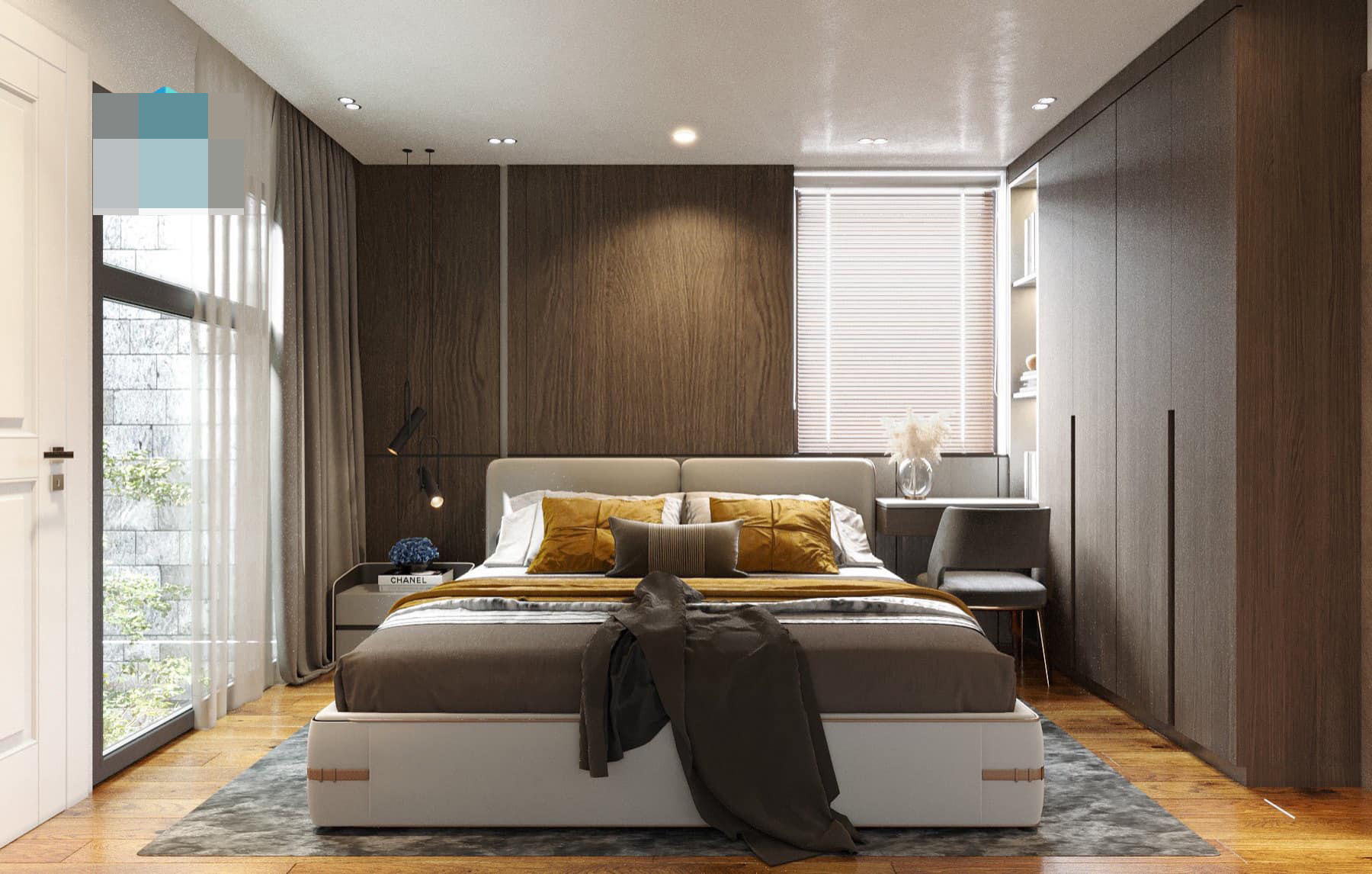 Phòng ngủ khách tone vàng và nâu trầm ấm, một mảng tường thay bằng cửa kính lớn, mở rộng tầm mắt ra khoảng không xanh mướt của vườn. Nhóm kiến trúc sư thiết kế theo phong cách tối giản, chú trọng đem đến cảm giác thư giãn, thoải mái để gia chủ nghỉ ngơi.