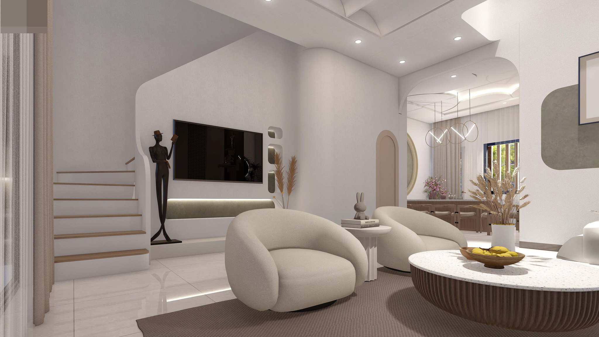 Phòng khách dùng tone trắng sữa làm chủ đạo. Bộ sofa lấy ý tưởng từ những cục kẹo bông. Bàn trà hình tròn rộng cho gia chủ thoải mái đặt đồ uống, đồ điểm tâm nhẹ khi có khách. Ánh sáng đèn điện kết hợp ánh sáng tự nhiên tạo ra độ sáng vừa phải, không bị chói.
