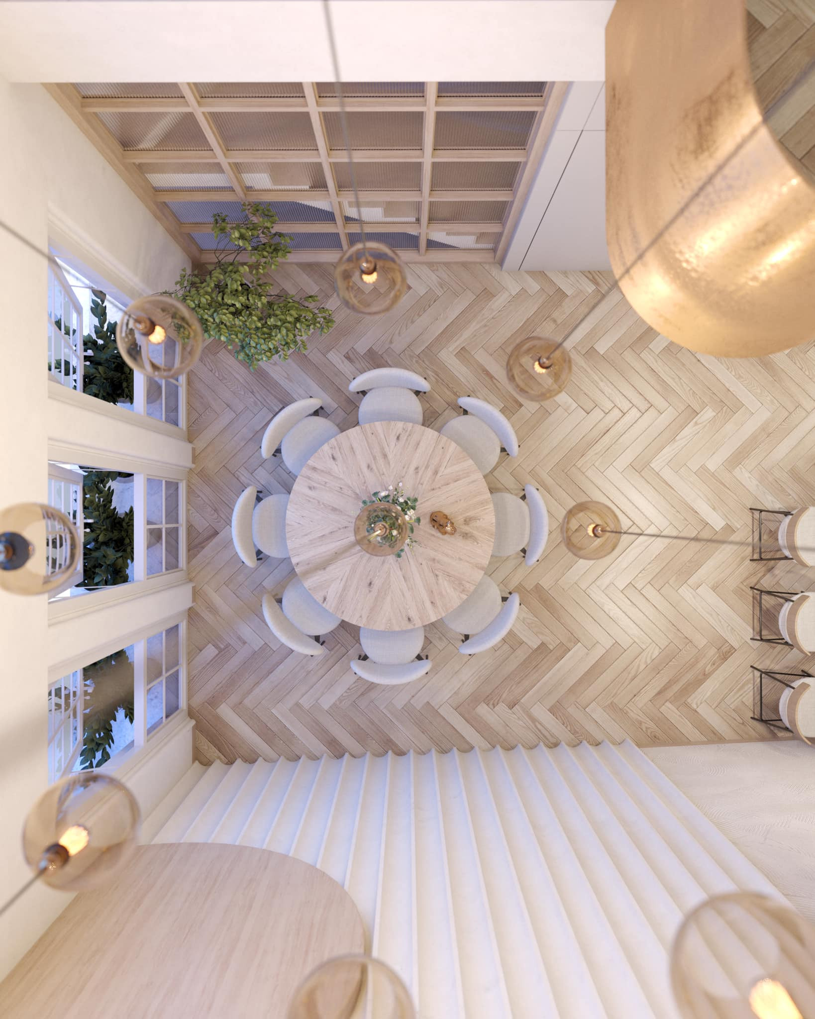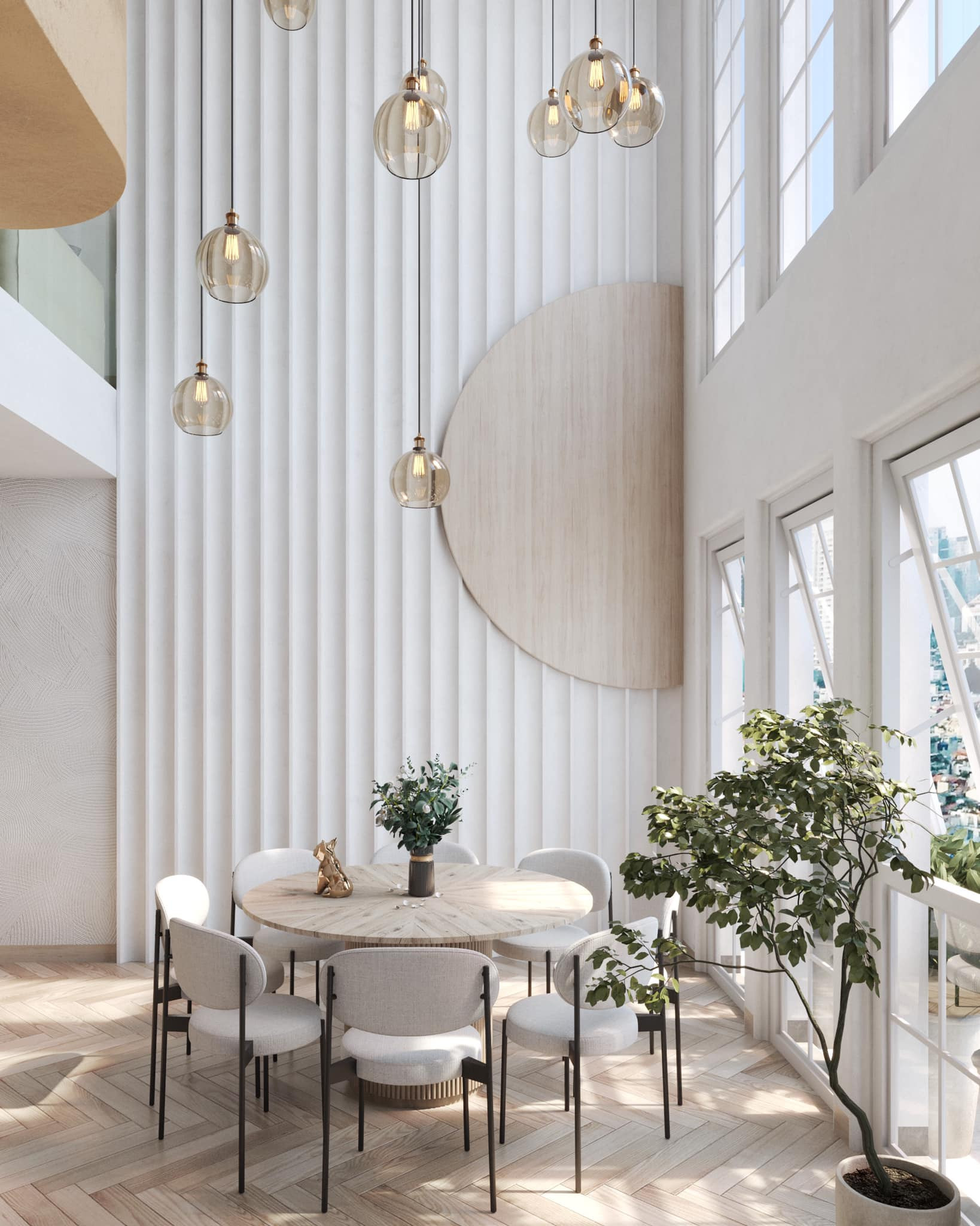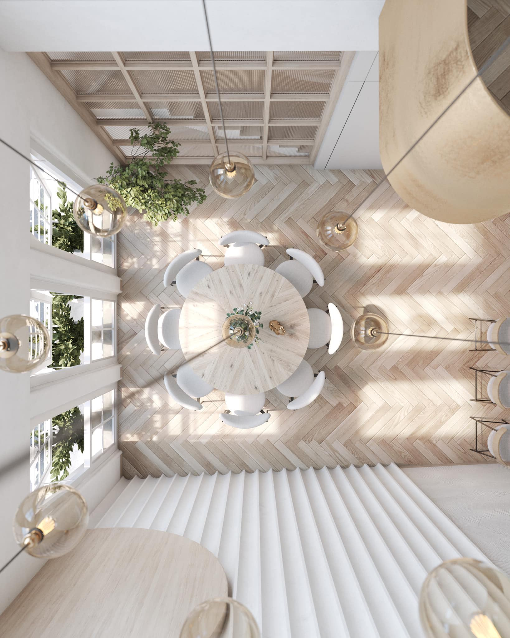 Không gian bàn ăn được đặt tại khu thông tầng 2-3, tạo ra một khối không gian thoáng đãng và rộng rãi.