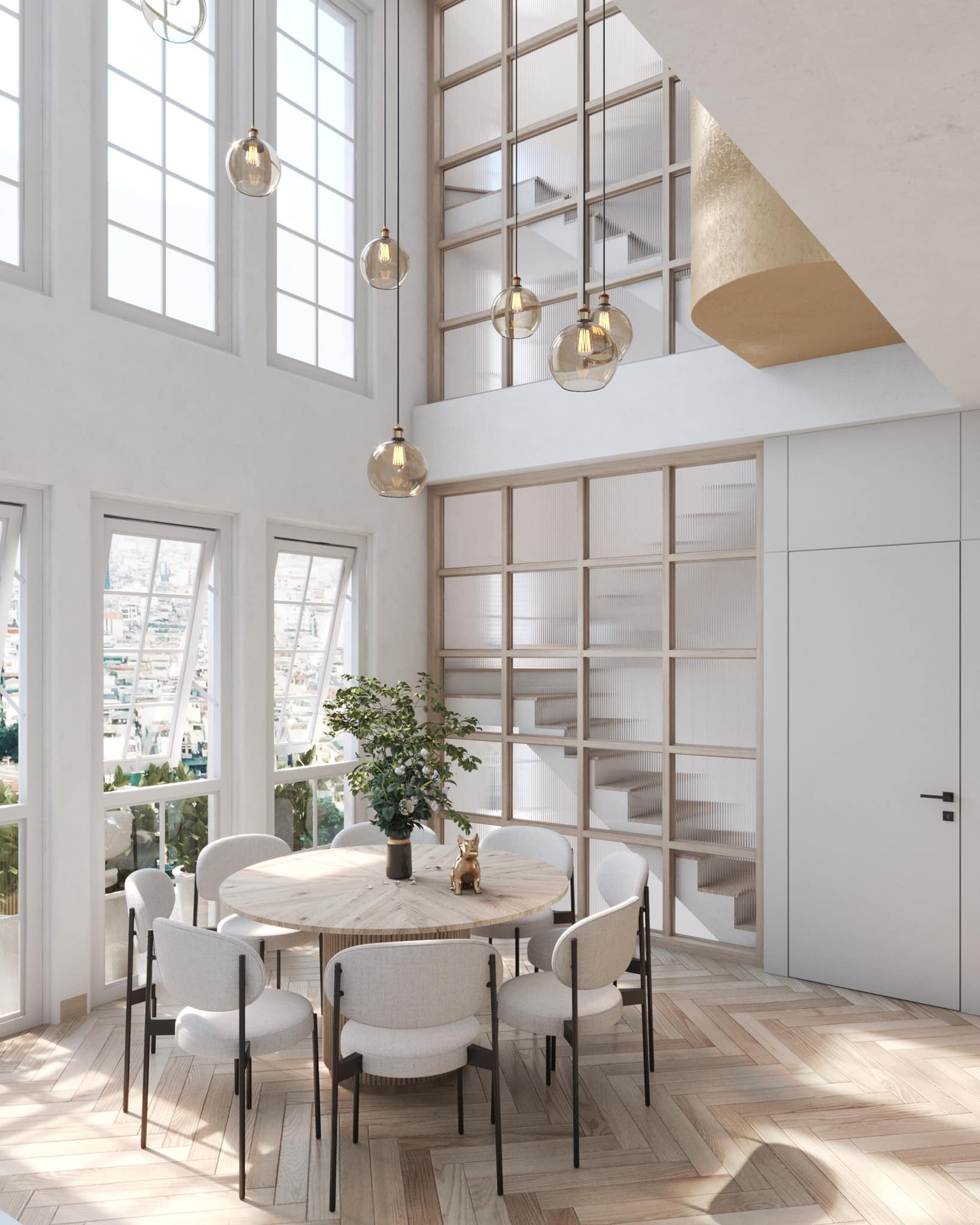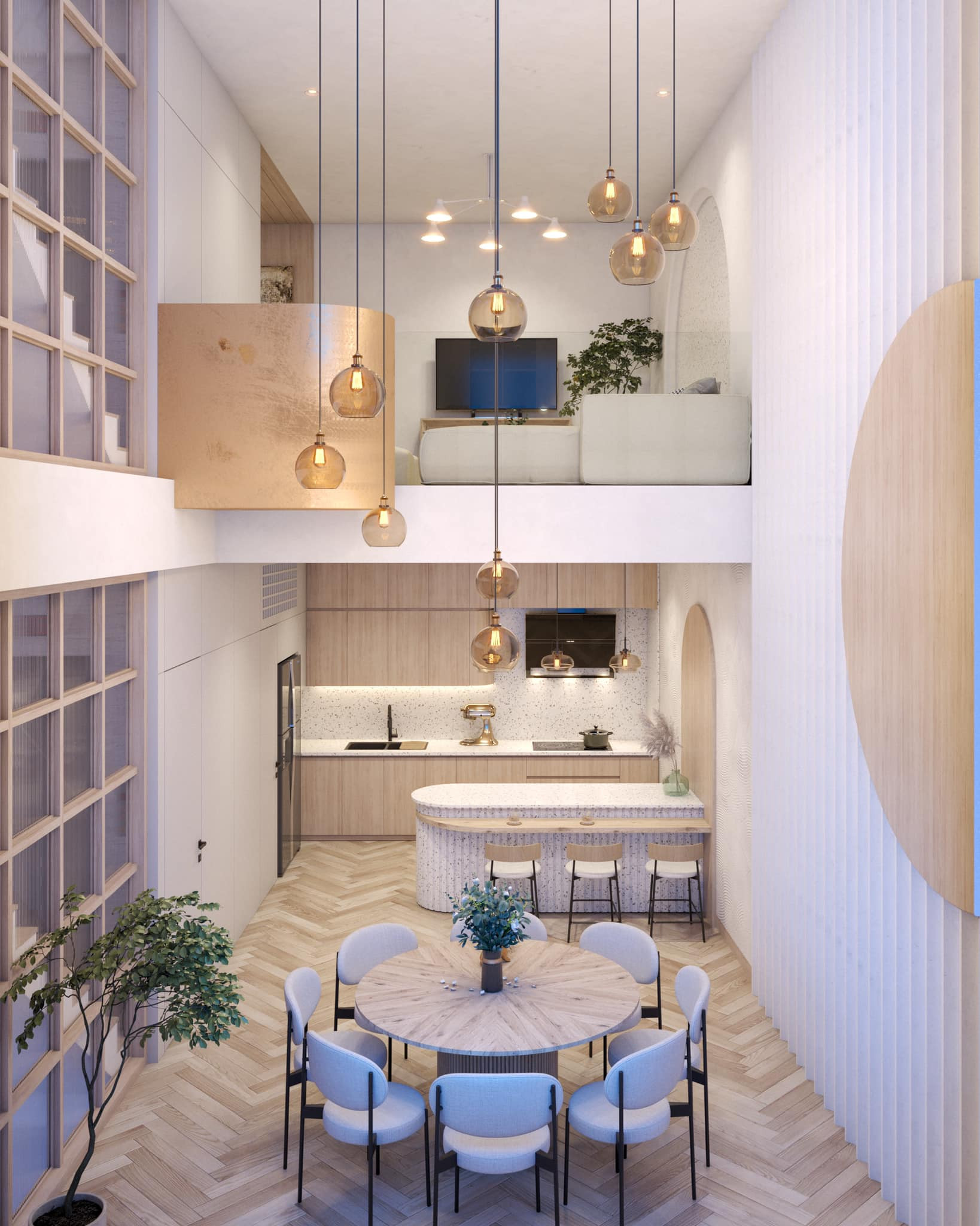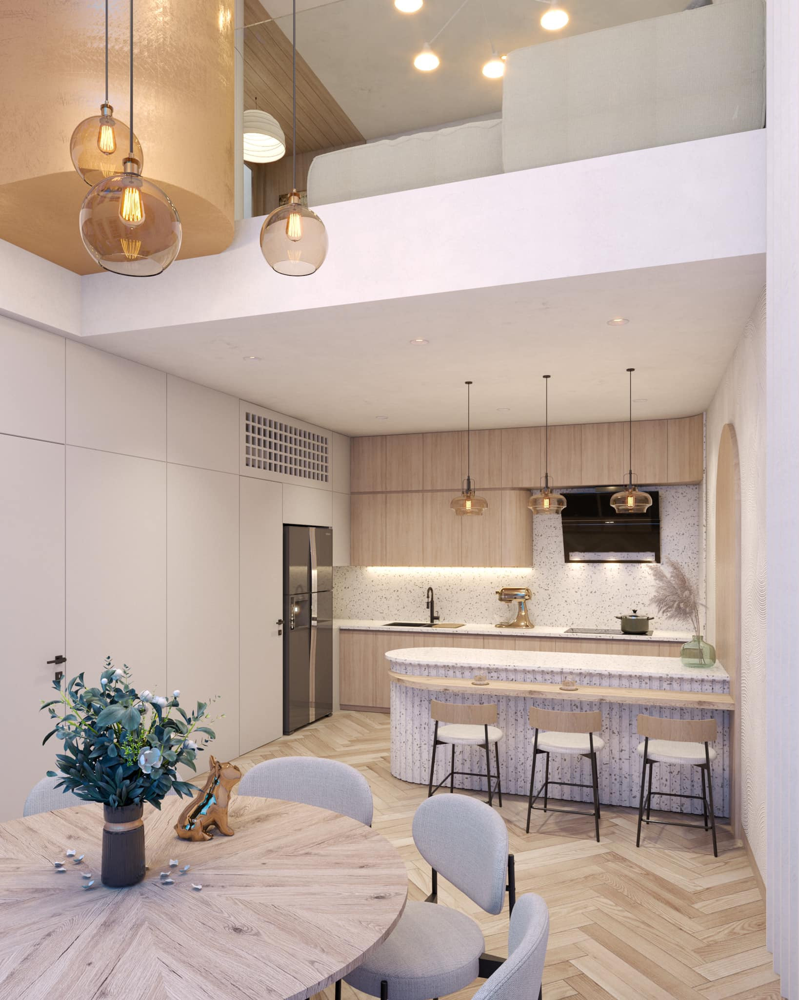 Không gian bàn ăn được đặt tại khu thông tầng 2-3, tạo ra một khối không gian thoáng đãng và rộng rãi.